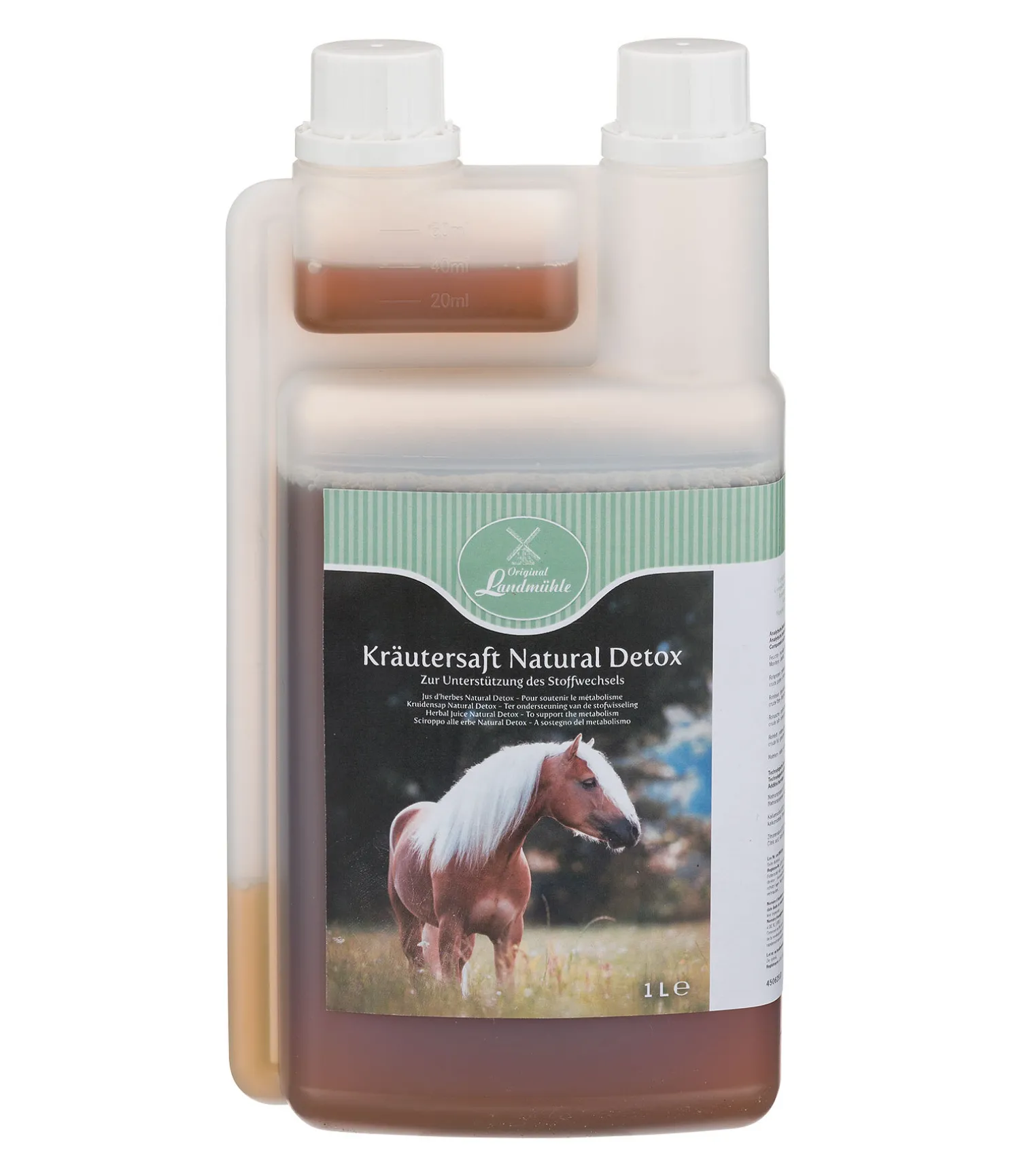 Aliment complémentaire pour chevaux. Jus d’herbes contenant du solidago et des graines de chardon-Marie pour soutenir le métabolisme et la mue.