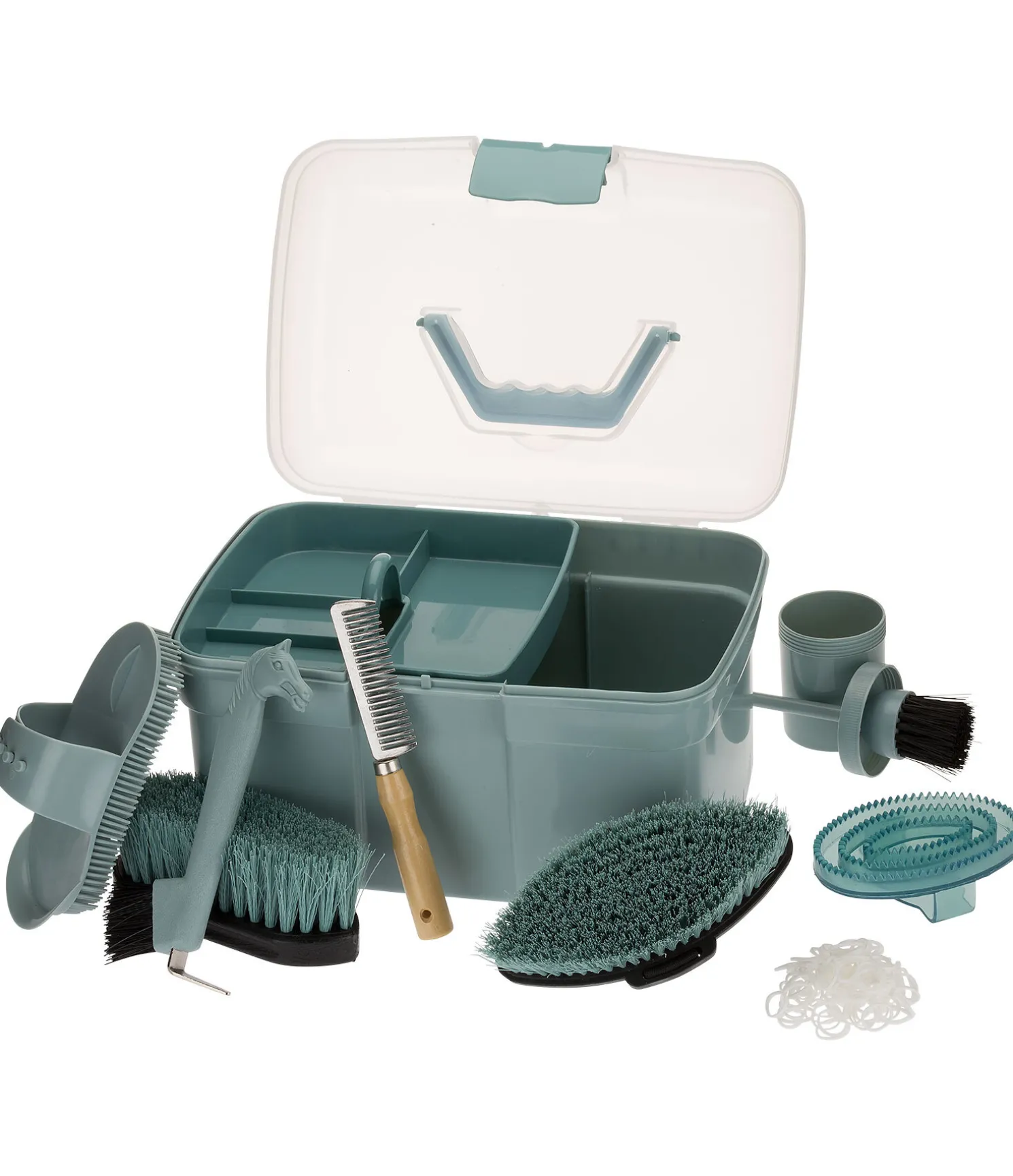 Coffre de pansage pratique avec couvercle transparent et instruments de pansage et de soin. Casier amovible pour les petits ustensiles. 30 x 20 x 19 cm. Contenu : bouchon, brosse douce, élastiques à natter, étrille en caoutchouc et étrille finlandaise, cure-pieds, peigne à crinière, pinceau à sabots.