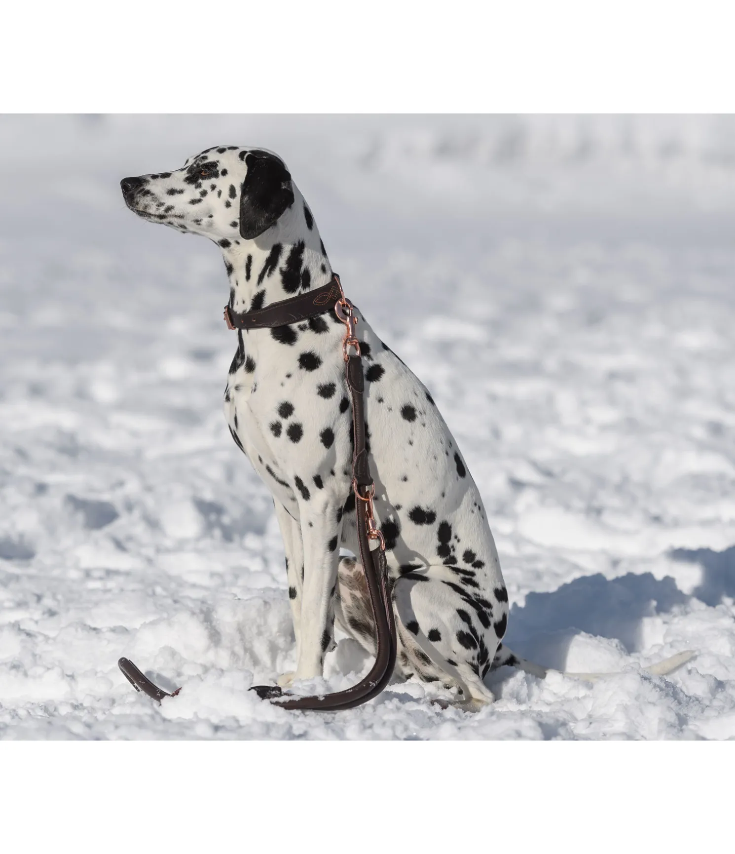 Laisse ronde en cuir véritable. Toucher doux. Longueur réglable sur 3 positions grâce à 3 anneaux et 1 mousqueton. Bouclerie rose doré dans la couleur BS et argentée dans la couleur BR et TB. Petit médaillon avec logo.