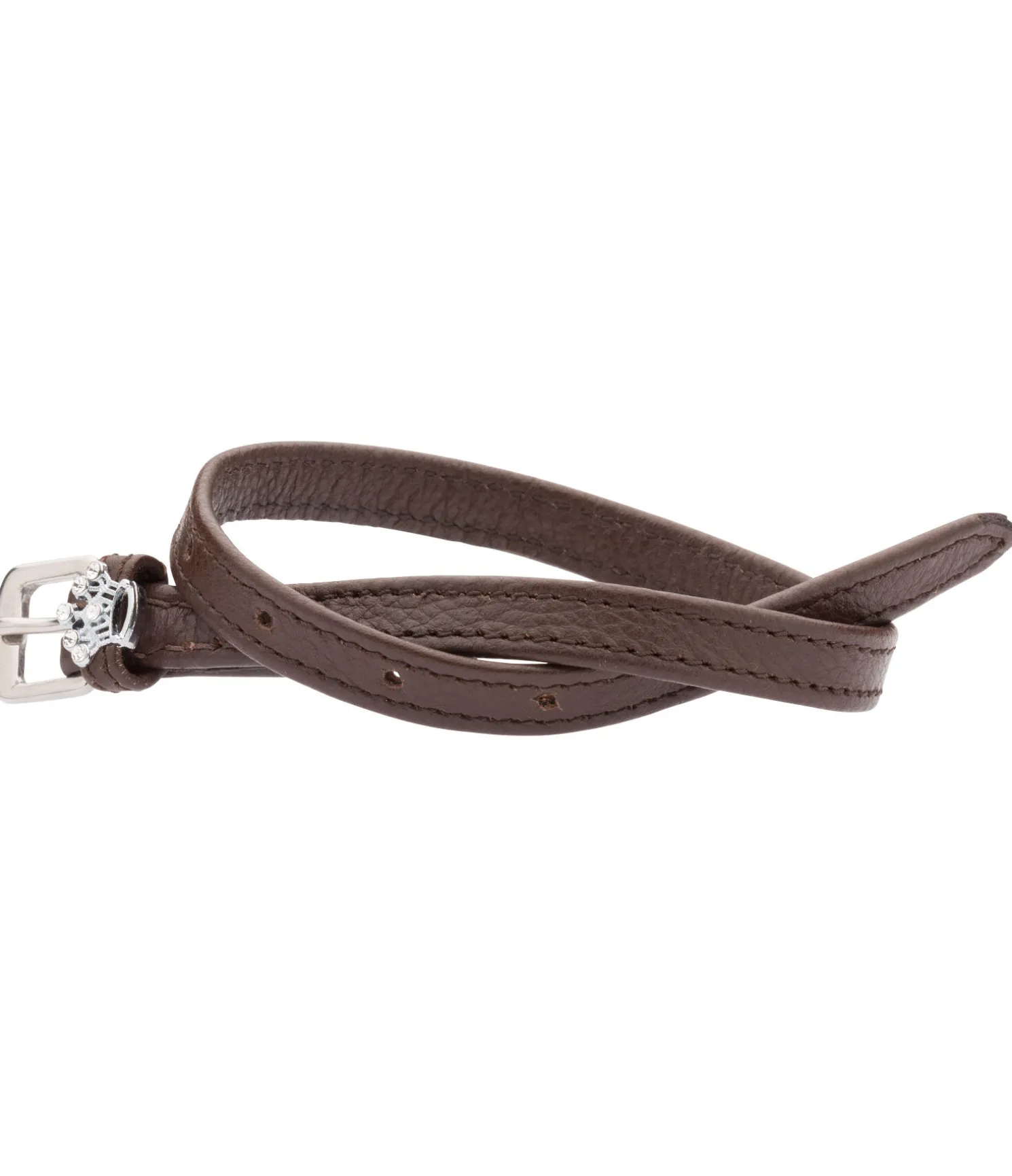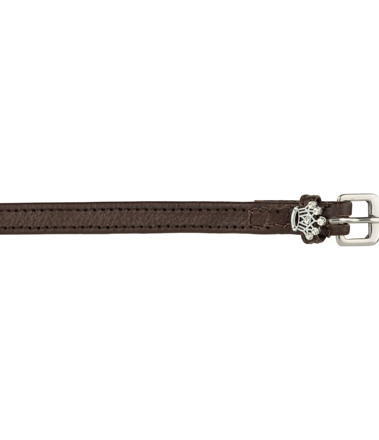 En cuir, avec boucles argentées et couronnes décoratives. La paire.