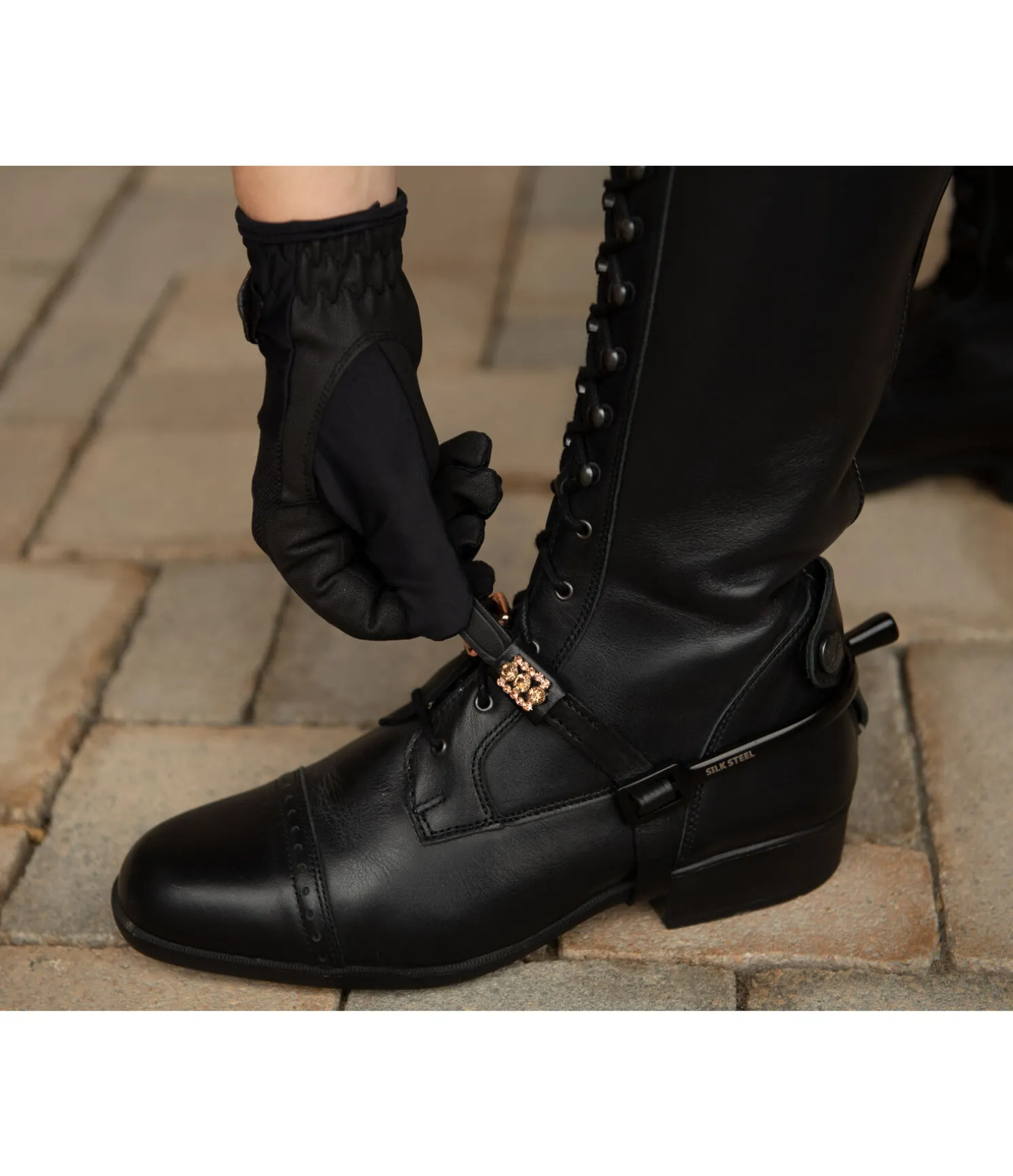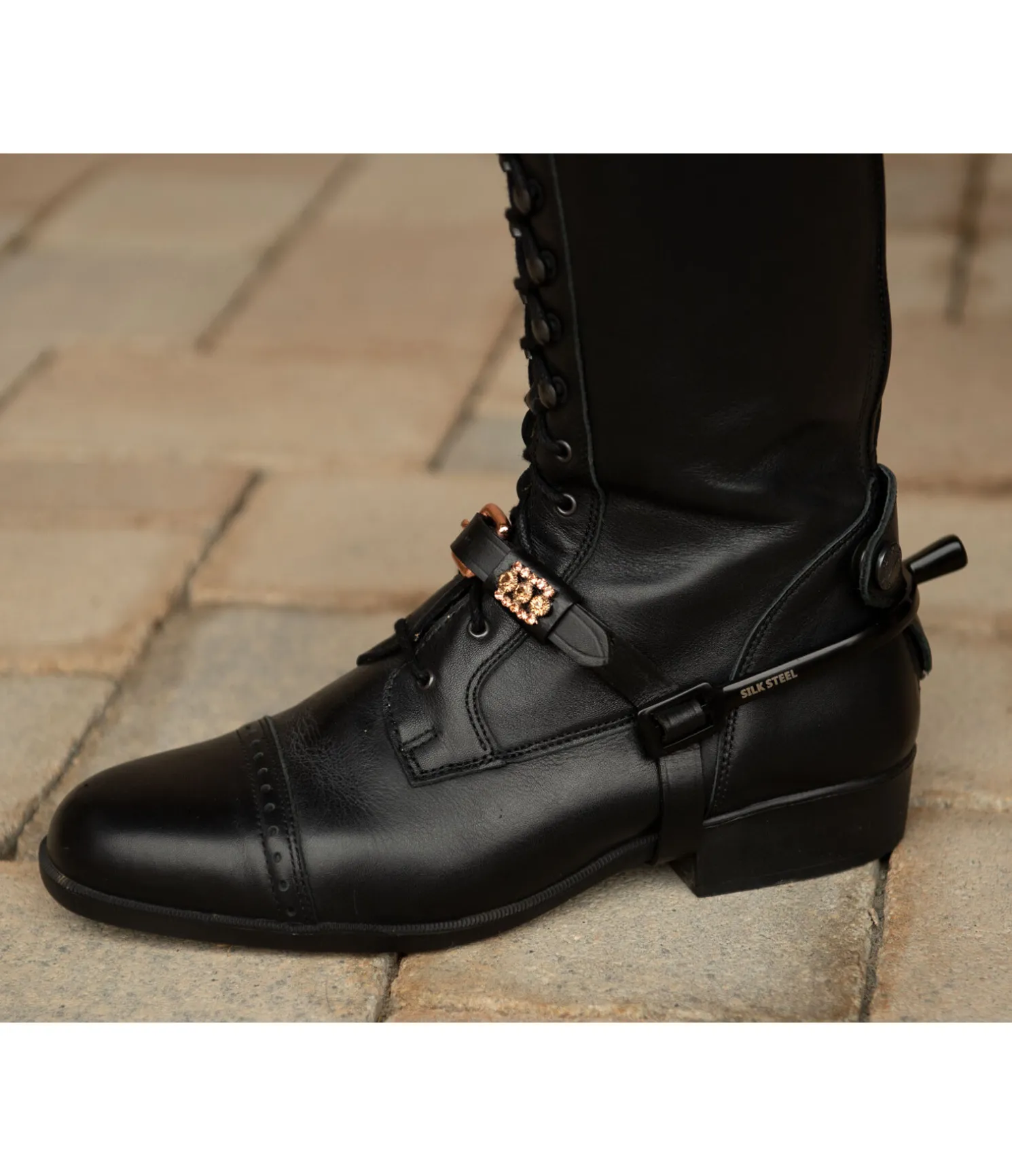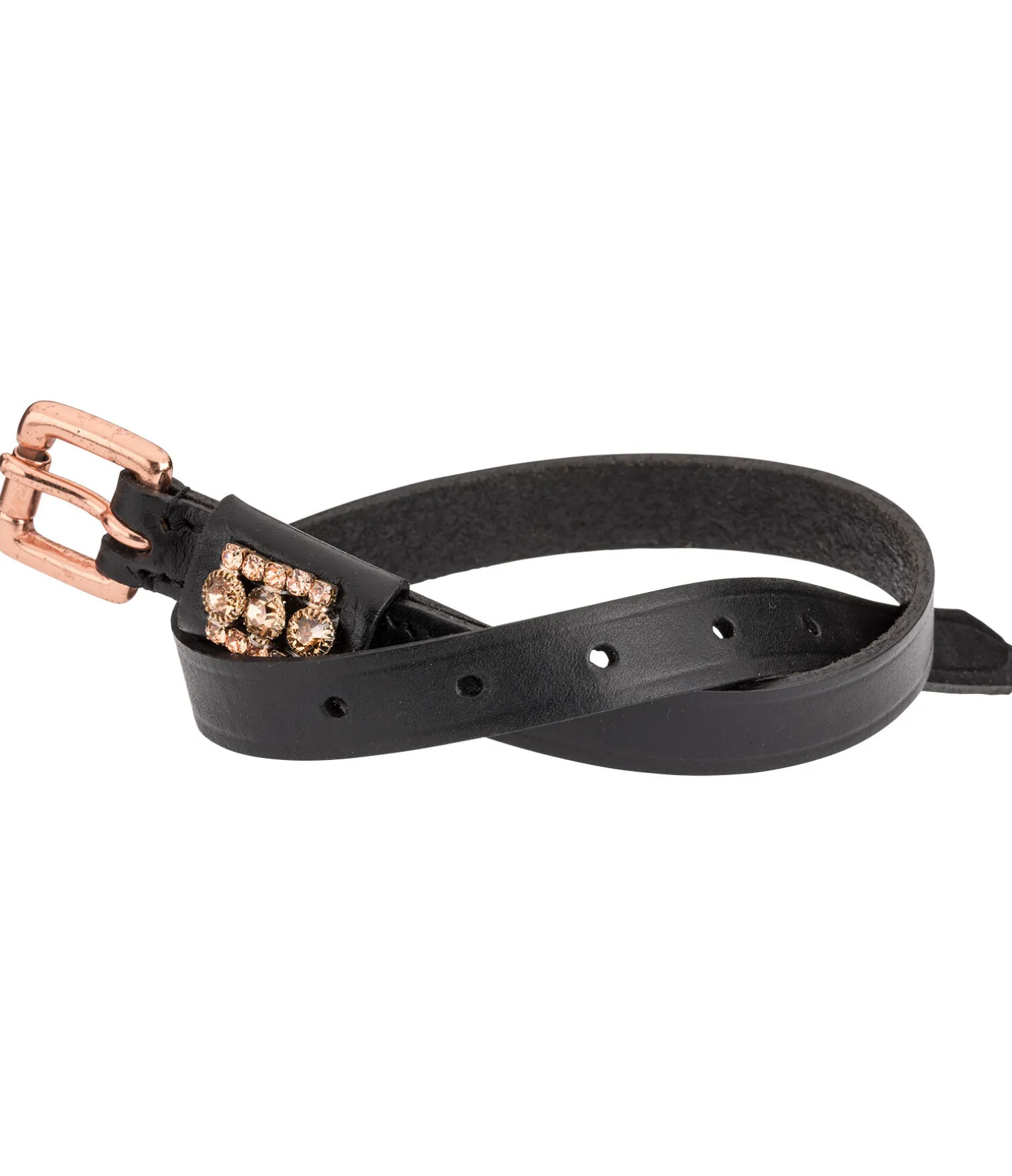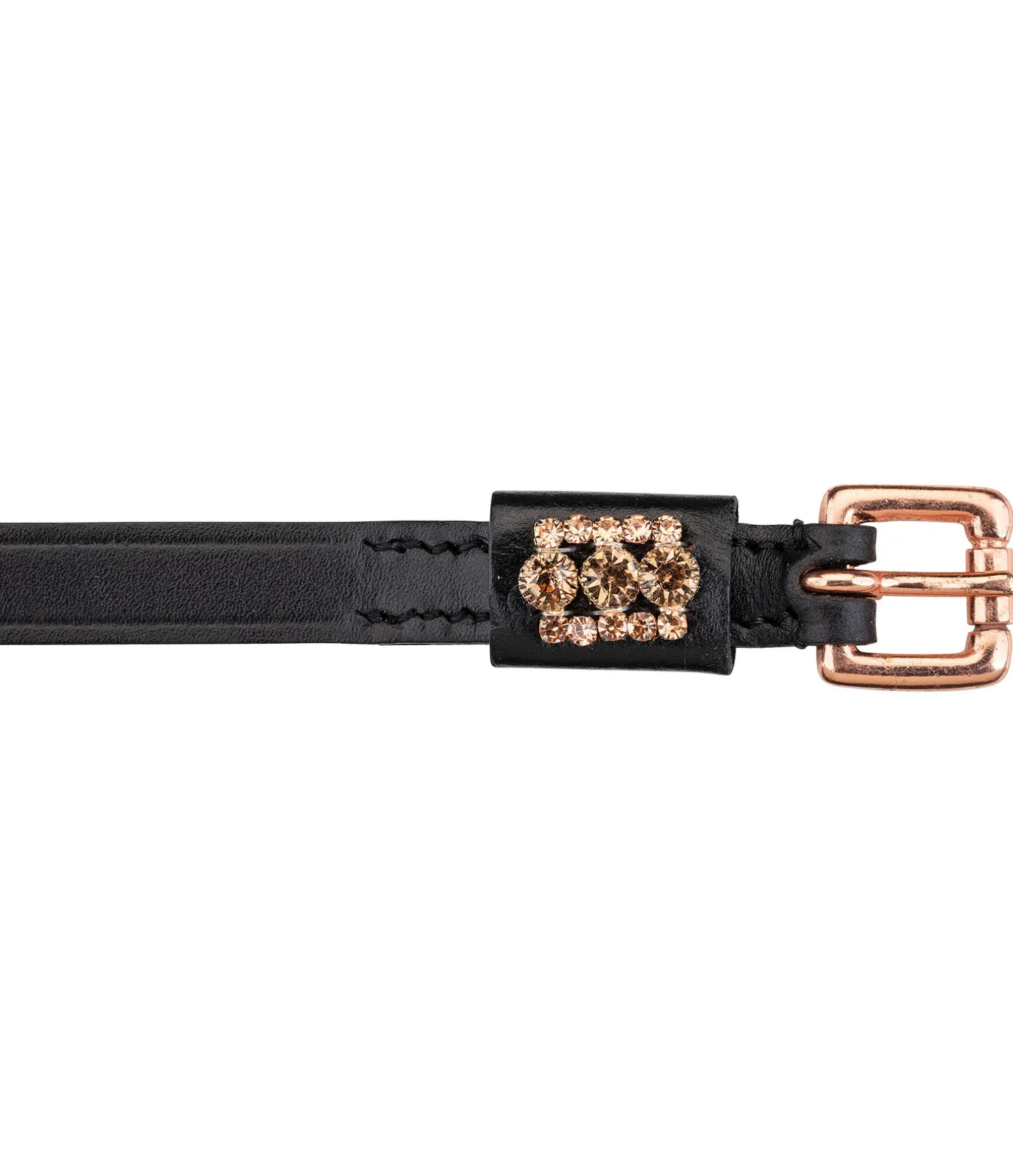 Lanières d’éperons en cuir noir véritable avec superbes boucles ornées de strass. Strass argentés en SI et rose doré en RG. La paire.