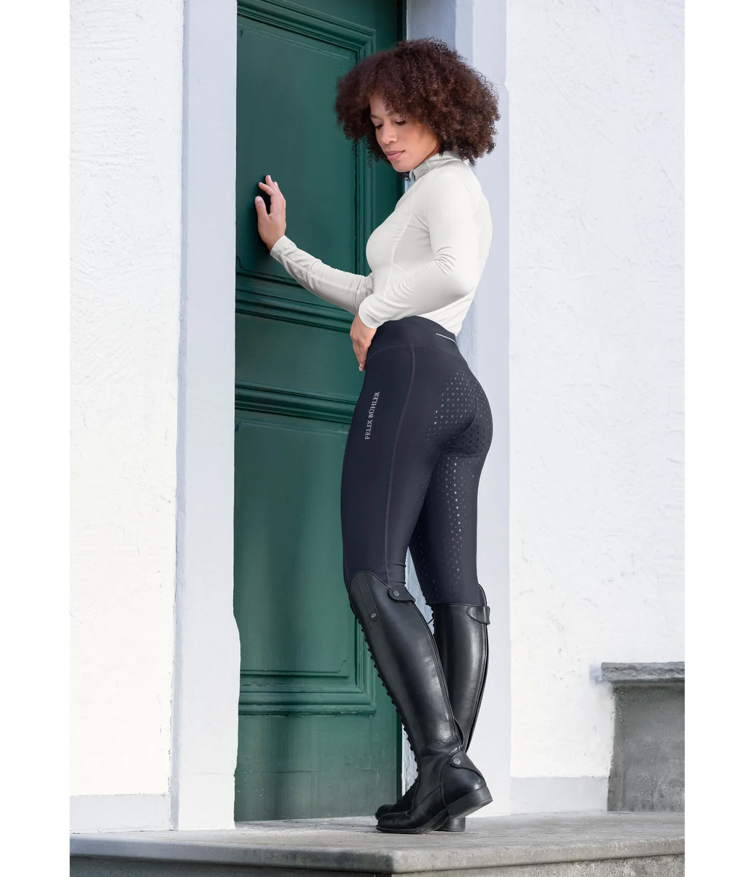 Legging d’équitation confortable. Fond intégral grip en silicone. Matière stretch extensible dans 4 directions. Ceinture extra large. Poche zippée arrière et poche latérale pour téléphone portable. Aucune couture au niveau des genoux. Bas de jambe extensible. Imprimé siliconé Felix Bühler. 90 % nylon, 10 % élasthanne.