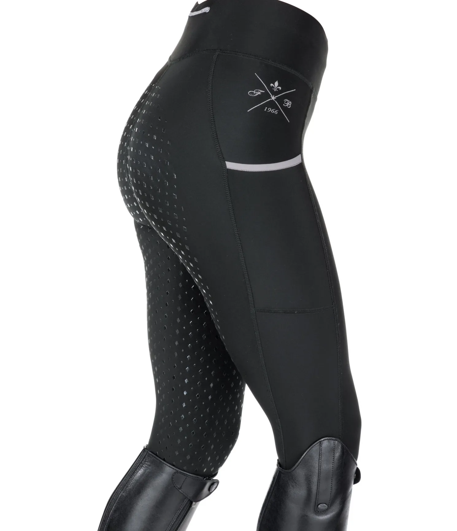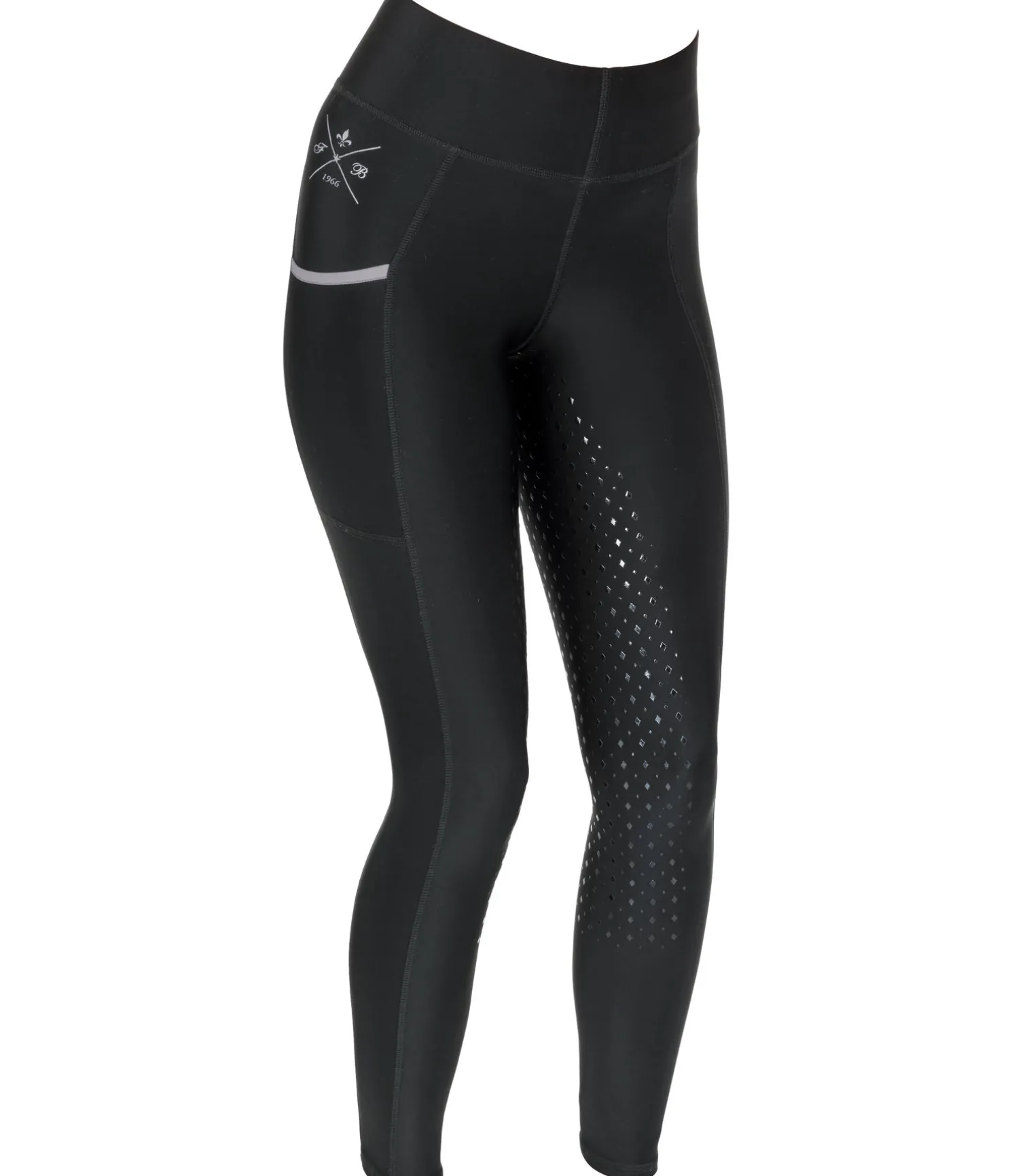 Legging d’équitation confortable. Fond intégral grip en silicone. Matière stretch extensible dans 4 directions. Ceinture extra large. Poche zippée arrière et poche latérale pour téléphone portable. Aucune couture au niveau des genoux. Bas de jambe extensible. Imprimé siliconé Felix Bühler. 90 % nylon, 10 % élasthanne.