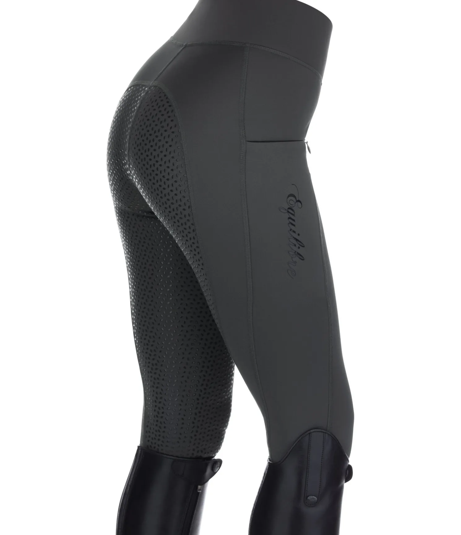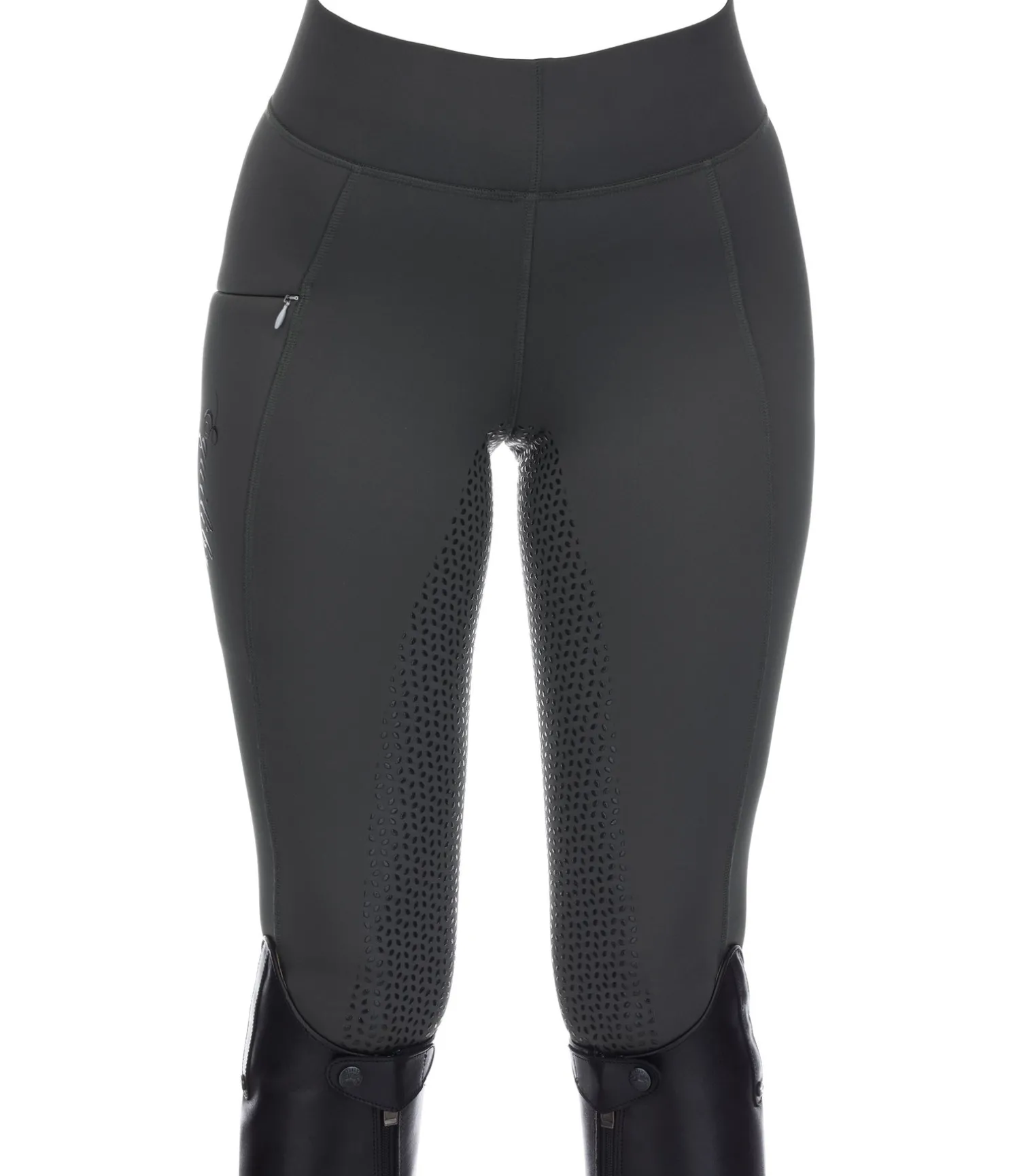 Legging d’équitation extensible avec fond intégral grip en silicone. Extérieur lisse et intérieur molletonné. Ceinture extra large élastiquée. Poche zippée pour téléphone portable sur la cuisse. Bas de jambe extensible sans patte auto-agrippante. 86 % polyester, 14 % élasthanne.