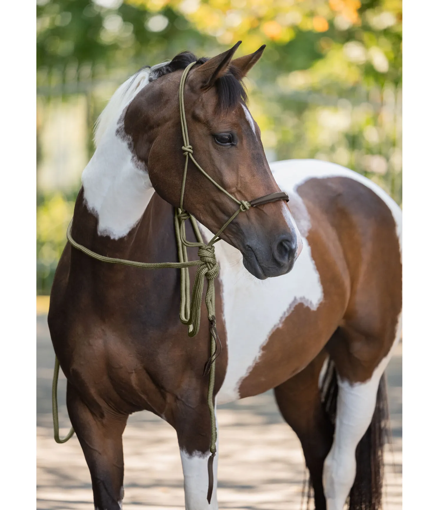 Locil à noeuds avec rênes mecate de 6,7 m de long ( Ø 1,6 cm) ce qui permet d’utiliser le licol également comme licol d’équitation ou de marche. Les extrémités des mecate sont dotées d’un revers en cuir. Rembourrage en cuir souple sur la muserolle avec logo en relief. Le noud du mécate peut être défait à la main, ce qui permet d’utiliser le licol comme licol à nouds normal. Le diamètre du licol est d’environ 0,7 cm: Licol 100 % de polypropylène.