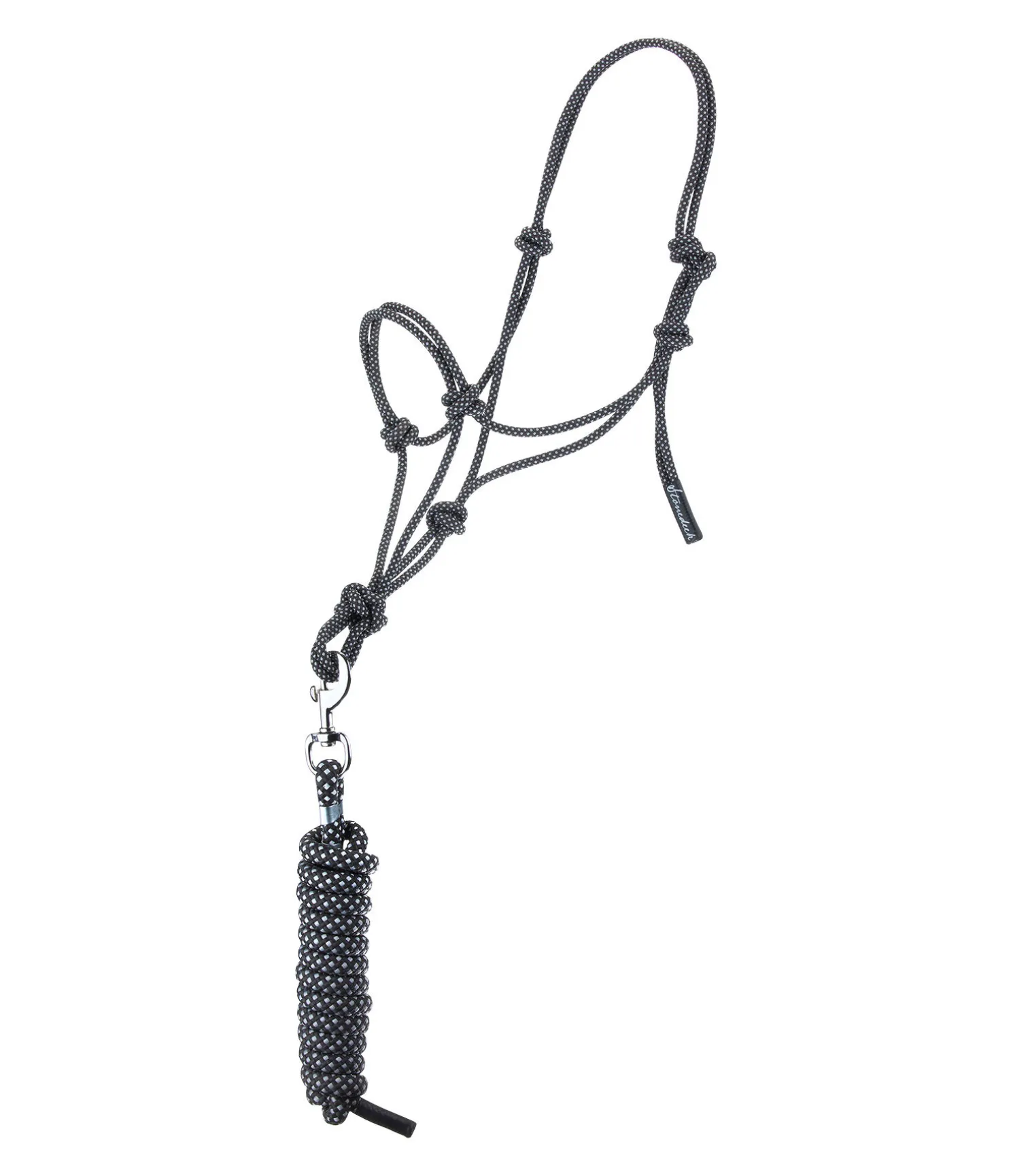 Ensemble composé d’un licol à noeuds et d’une longe avec mousqueton Bolt Snap. Convient pour le travail au sol. Longueur : 2,50 m.