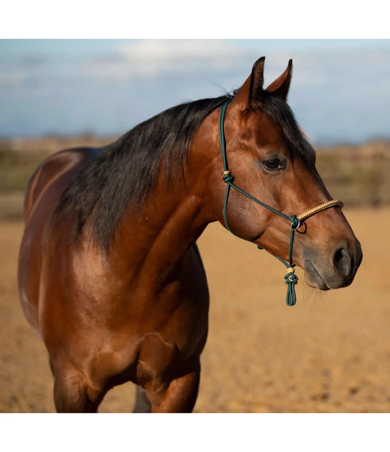 Magnifique licol à noeuds avec muserolle réglable. Idéal pour une communication précise avec le cheval. Muserolle renforcée et anneaux pour rênes. Épaisseur de la corde 6 mm. Avec pompon. 100 % polypropylène.