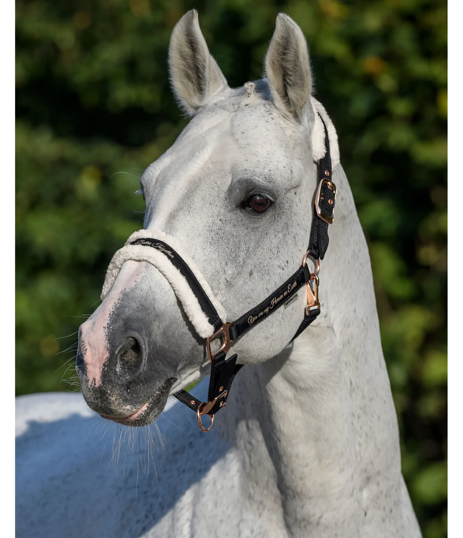 Licol original avec rembourrage en polaire Teddy douce à la têtière et à la muserolle. Broderies en fil scintillant : « Better Together » sur la muserolle et « You are my Heaven on Earth » sur les montants. Têtière doublement réglable et muserolle facile à régler. Avec mousqueton. Broderies et bouclerie argentées pour les couleurs AN et DQ, rose doré pour les couleurs SR, MR et FZ, et dorées en MA. Licol 100 % polypropylène, polaire Teddy 100 % polyester.