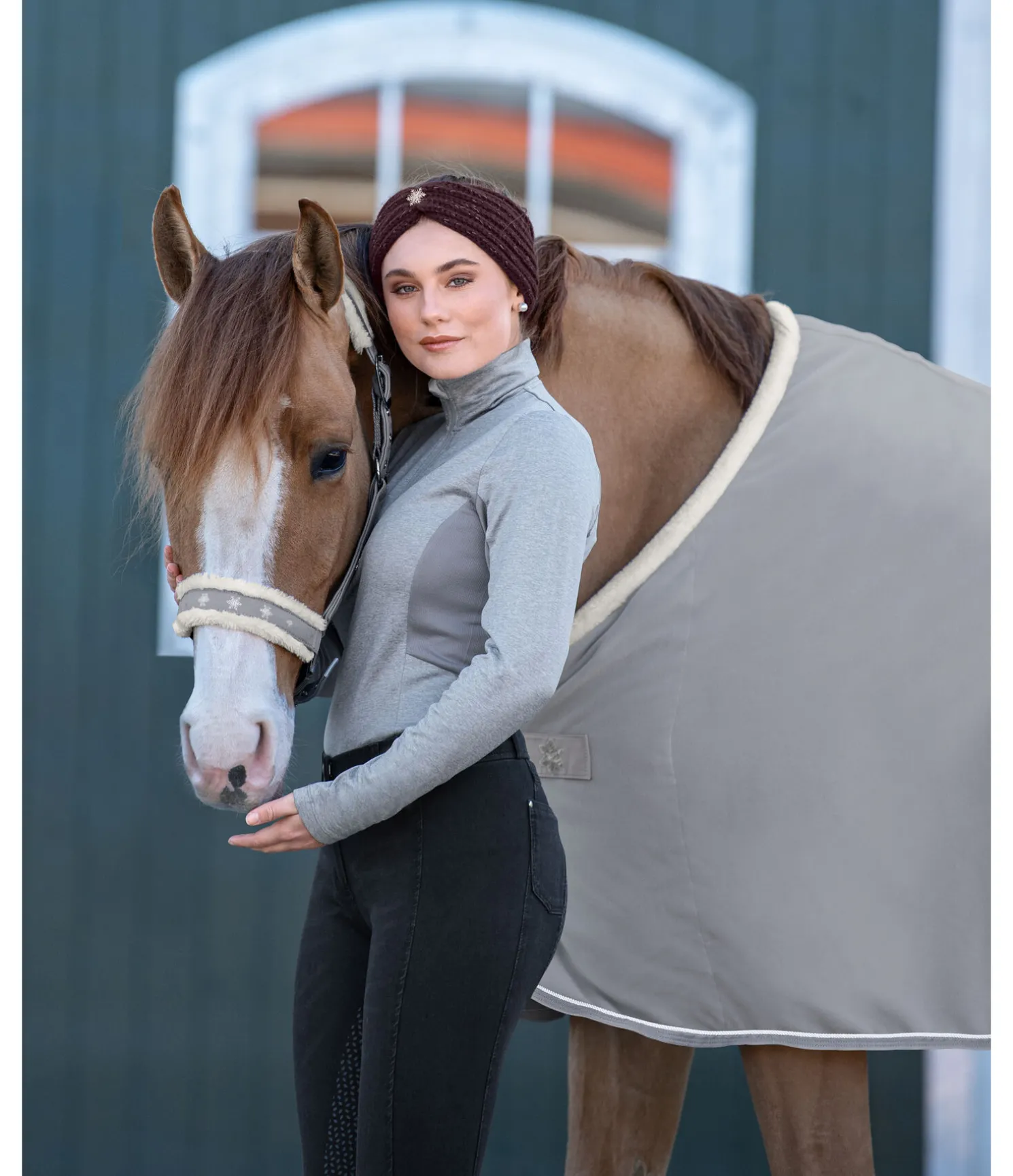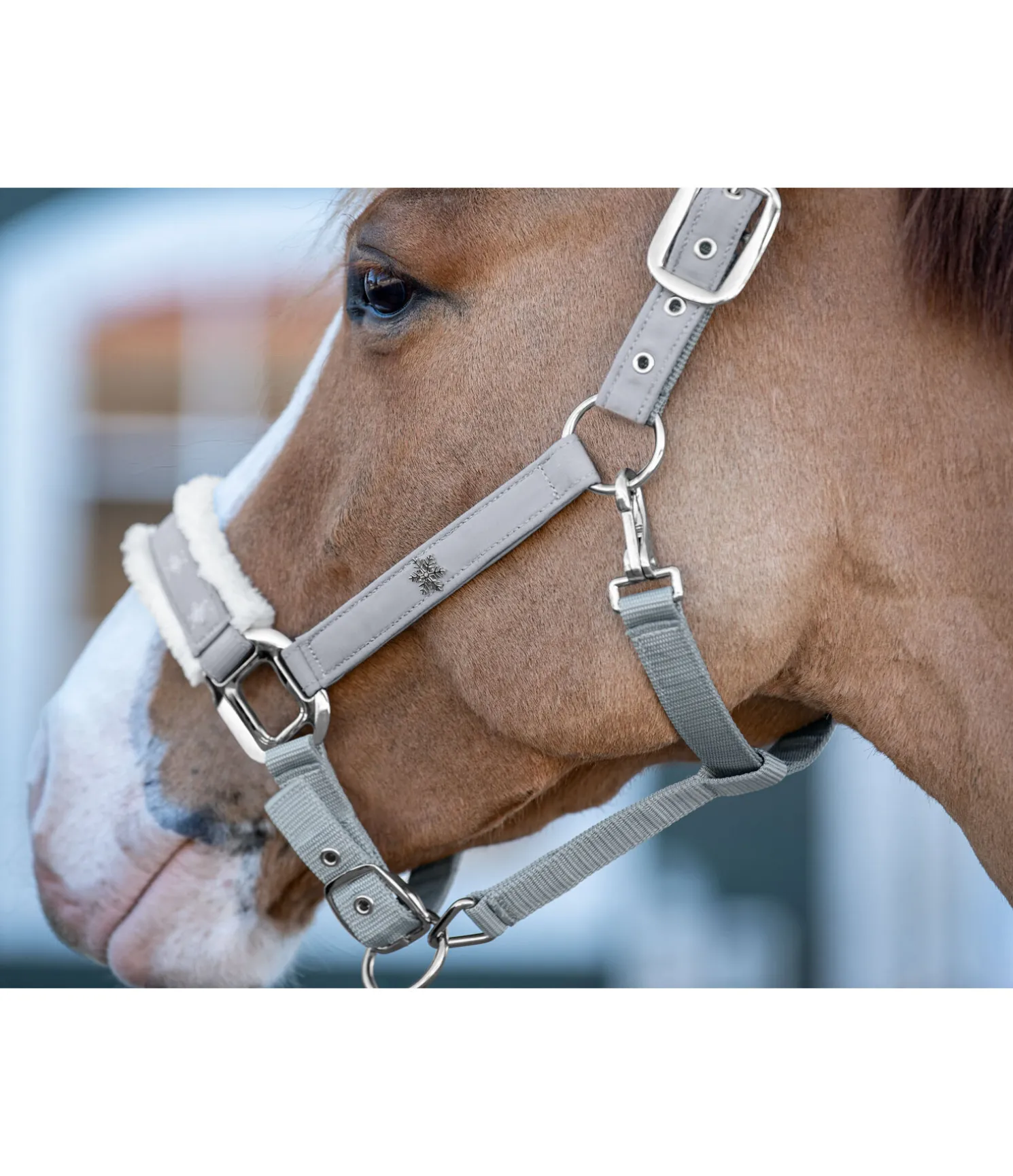 Licol de Noël. Rembourrage en polaire Teddy sur la têtière et la muserolle. Flocons de neige brodés sur la muserolle et sur chaque montant.