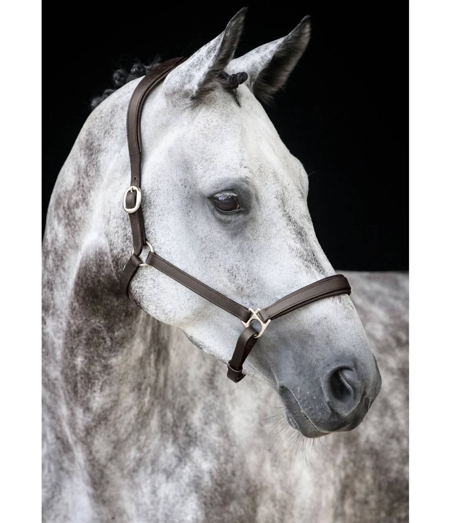 Licol de forme anatomique en cuir gras avec doublure douce en cuir à la têtière et la muserolle. Gaufrage logo discret sur la têtière. Têtière et muserolle réglables. Bouclerie argentée.