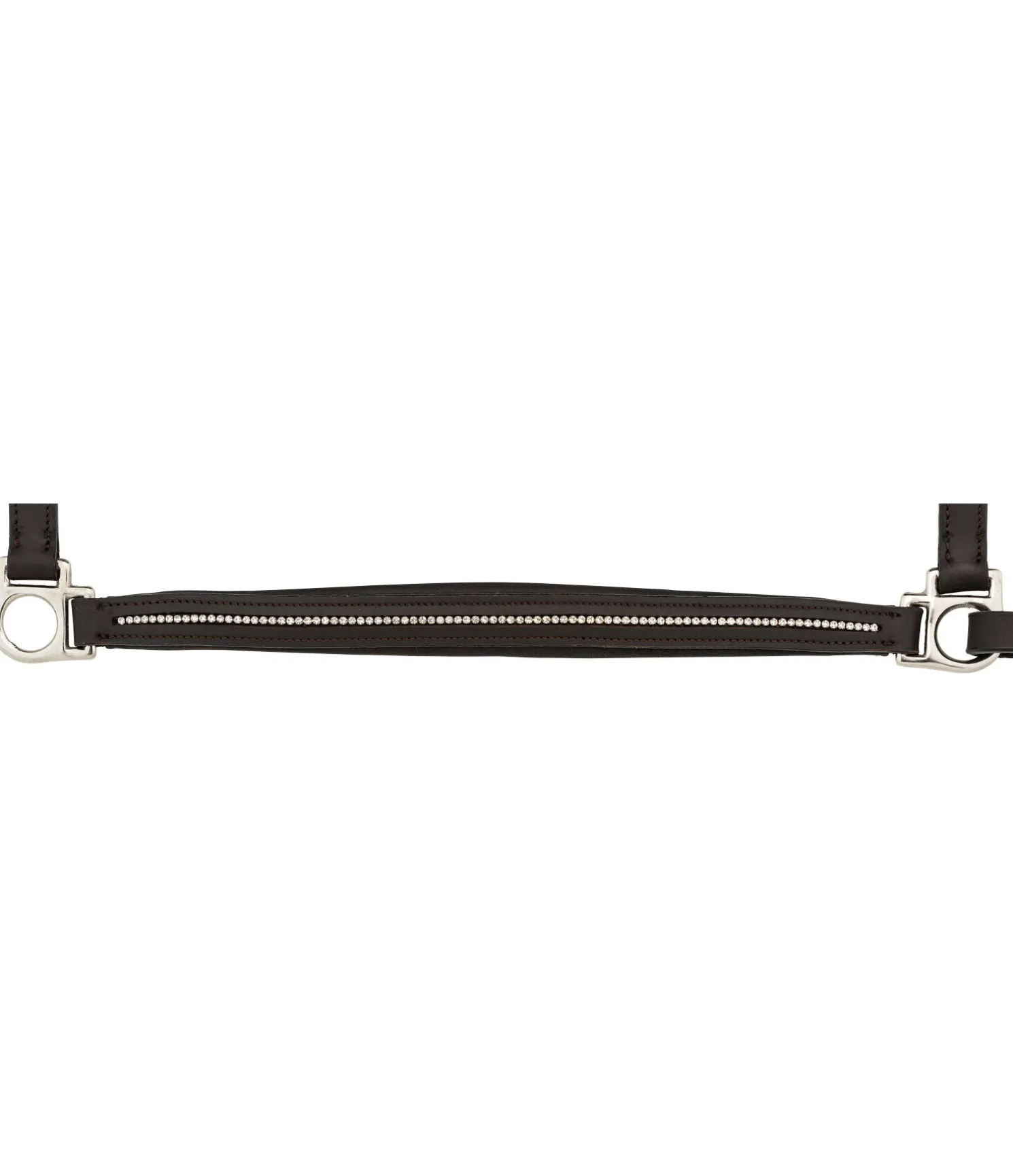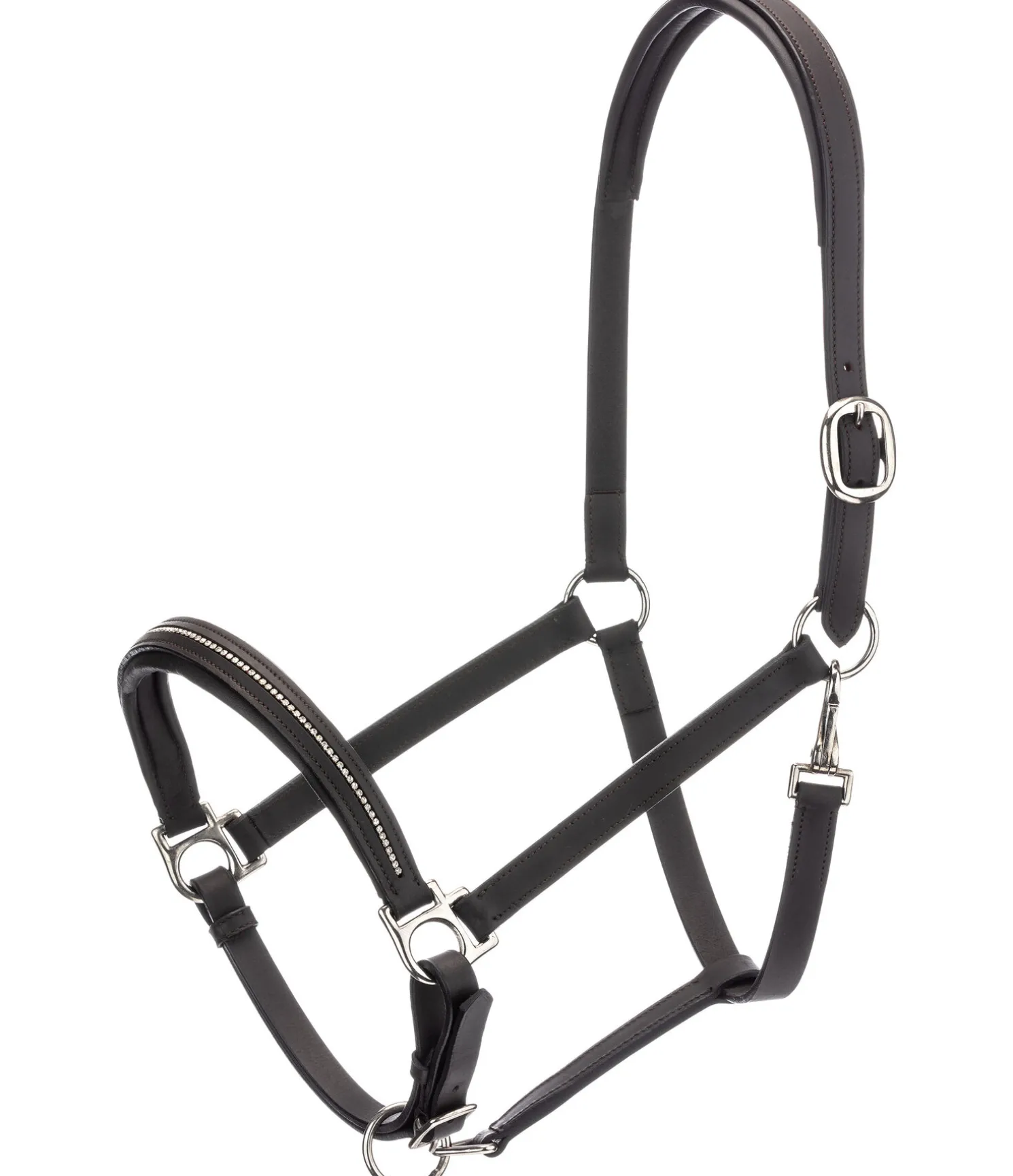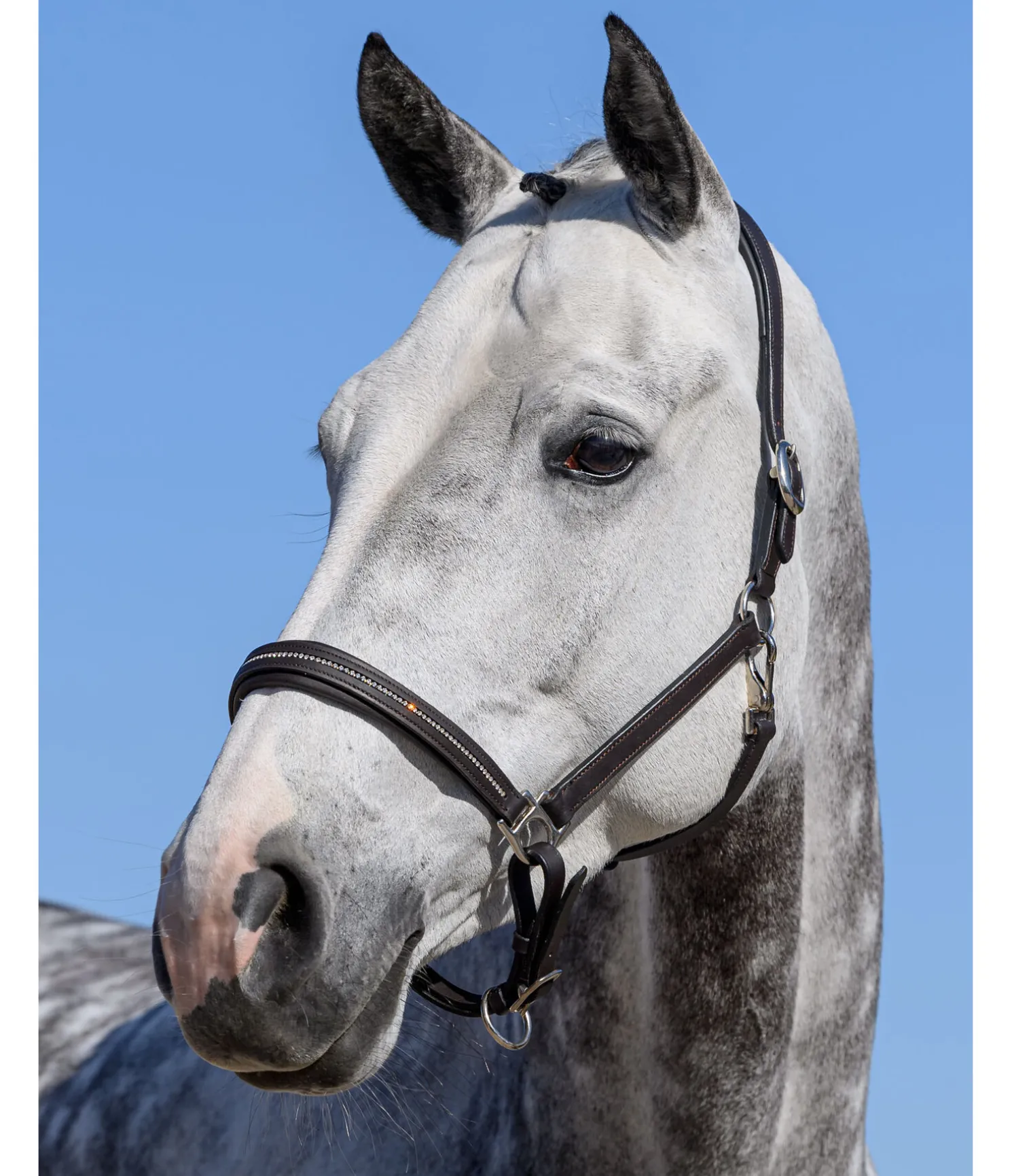 Licol en cuir gras orné d’une rangée de petits strass blancs discrets sur la muserolle. Doublure moelleuse en cuir véritable à la muserolle et la têtière pour un confort optimal. Têtière et muserolle facilement réglables. Bouclerie argentée.
