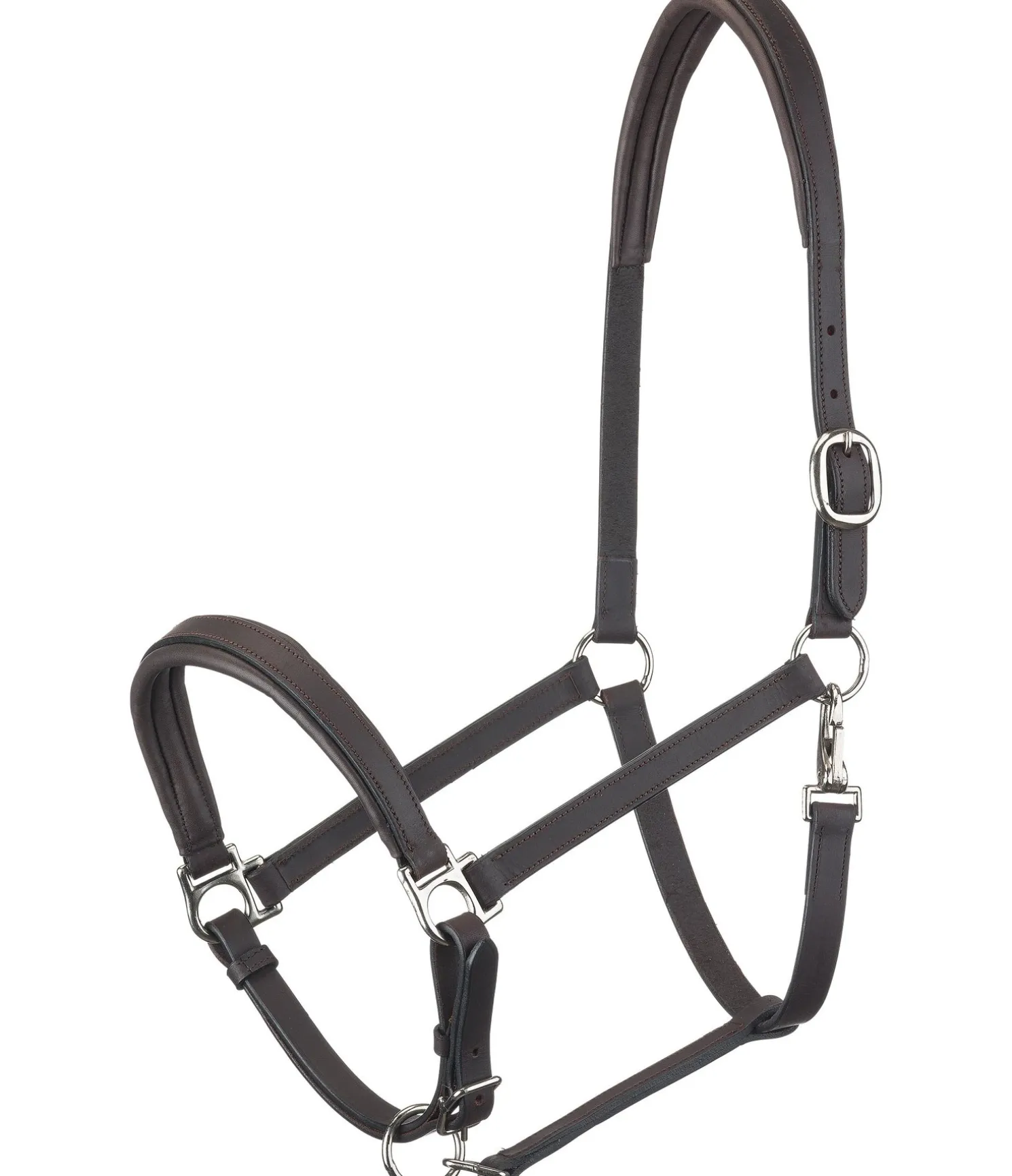 Licol en cuir gras classique de coupe simple avec doublure en cuir moelleux à la têtière et à la muserolle. Logo discret embossé sur la têtière. Têtière et muserolle facilement réglables. Bouclerie argentée.