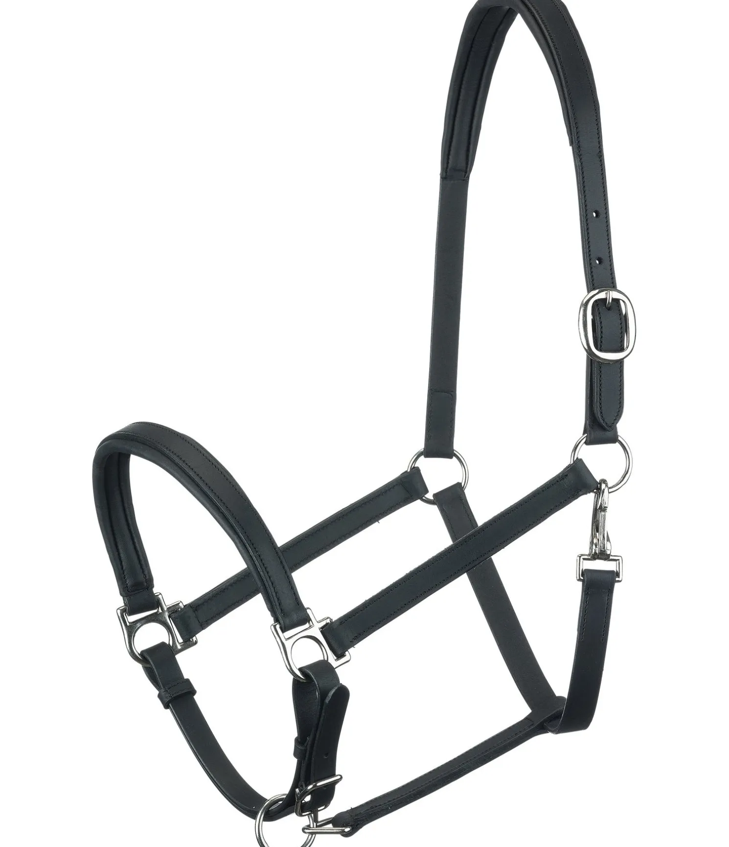 Licol en cuir gras classique de coupe simple avec doublure en cuir moelleux à la têtière et à la muserolle. Logo discret embossé sur la têtière. Têtière et muserolle facilement réglables. Bouclerie argentée.