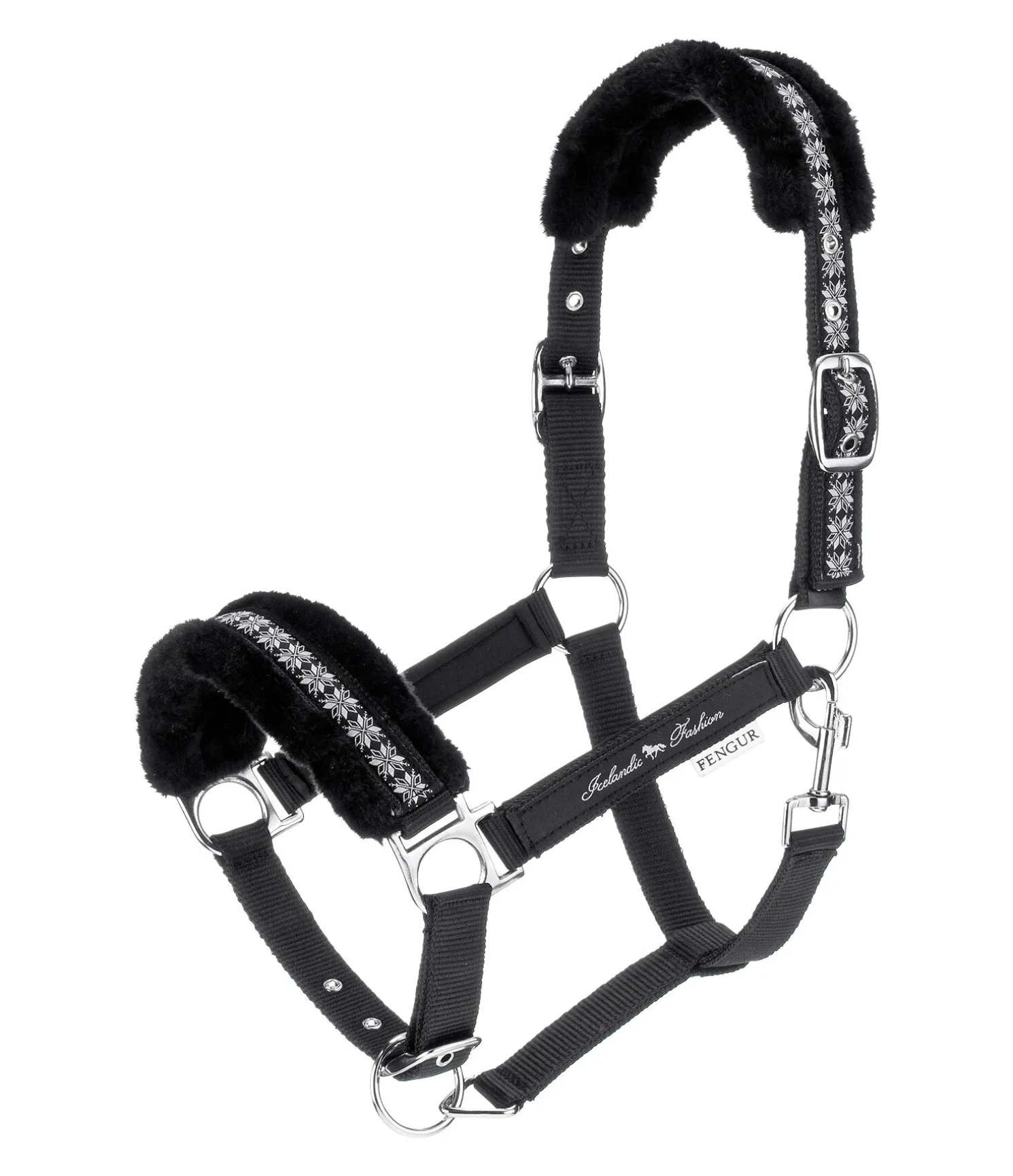 Licol en polaire Teddy au look nordique. Taille réglable de chaque côté au niveau de la têtière et facilement ajustable au niveau de la muserolle. 100 % polyester.