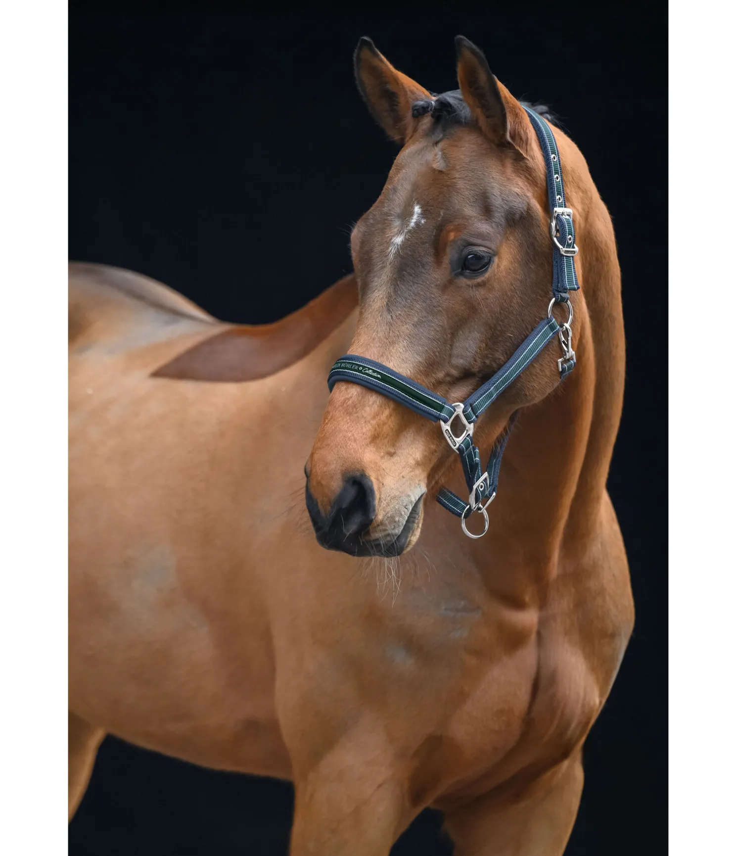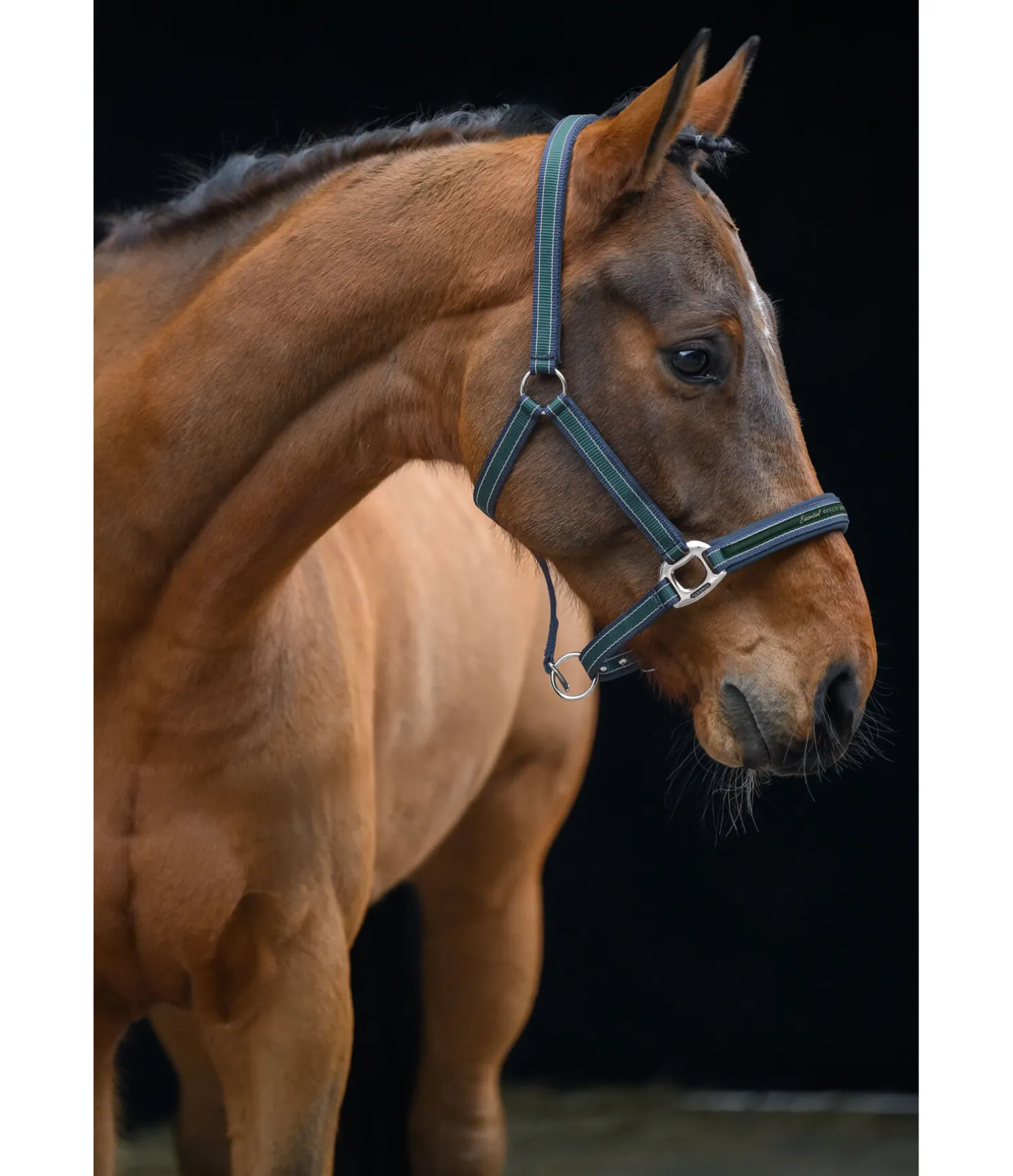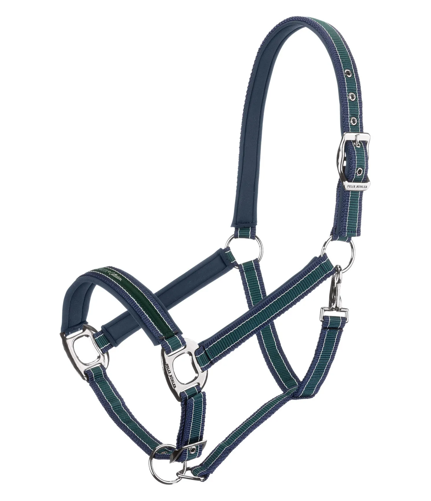 Licol rayé dans un look sportif avec élégante bande cousue sur la muserolle. Doublure douce en caoutchouc chloroprène sur la têtière, la muserolle et les montants. Têtière et muserolle réglables. Licol 100 % polypropylène.