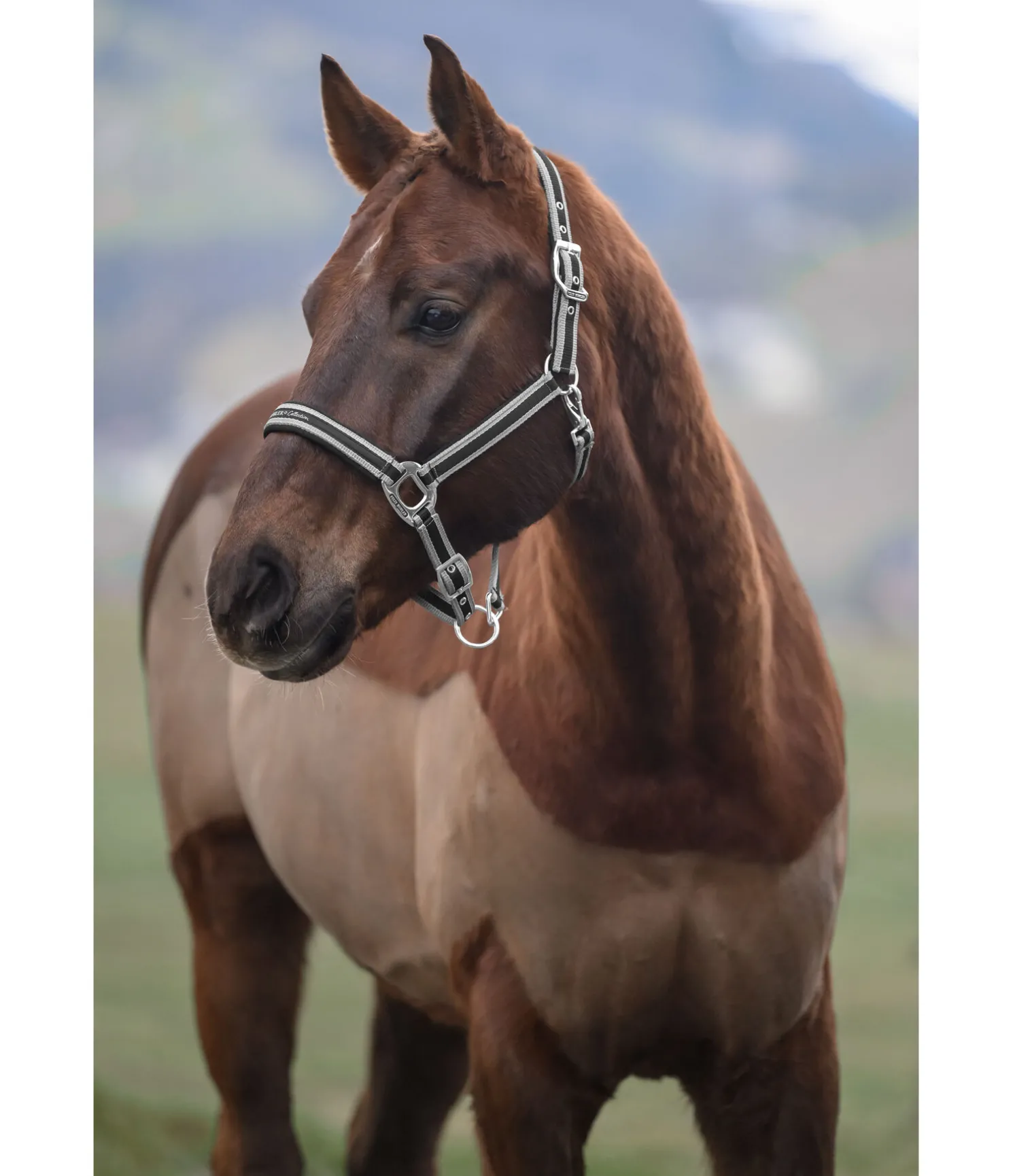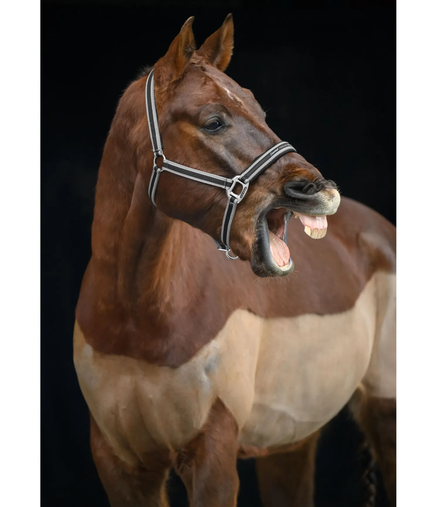 Licol rayé dans un look sportif avec élégante bande cousue sur la muserolle. Doublure douce en caoutchouc chloroprène sur la têtière, la muserolle et les montants. Têtière et muserolle réglables. Licol 100 % polypropylène.