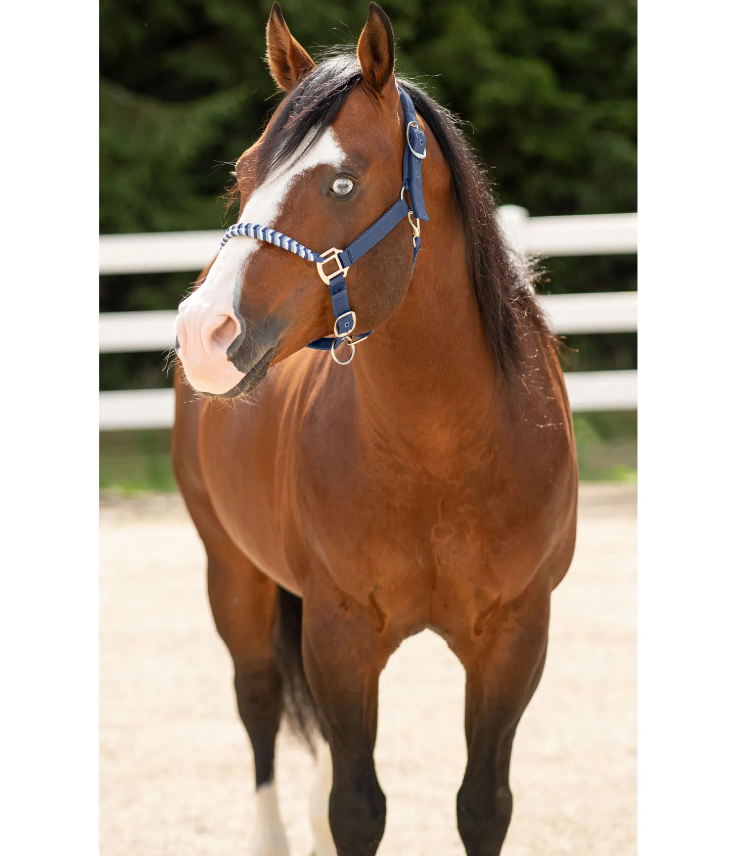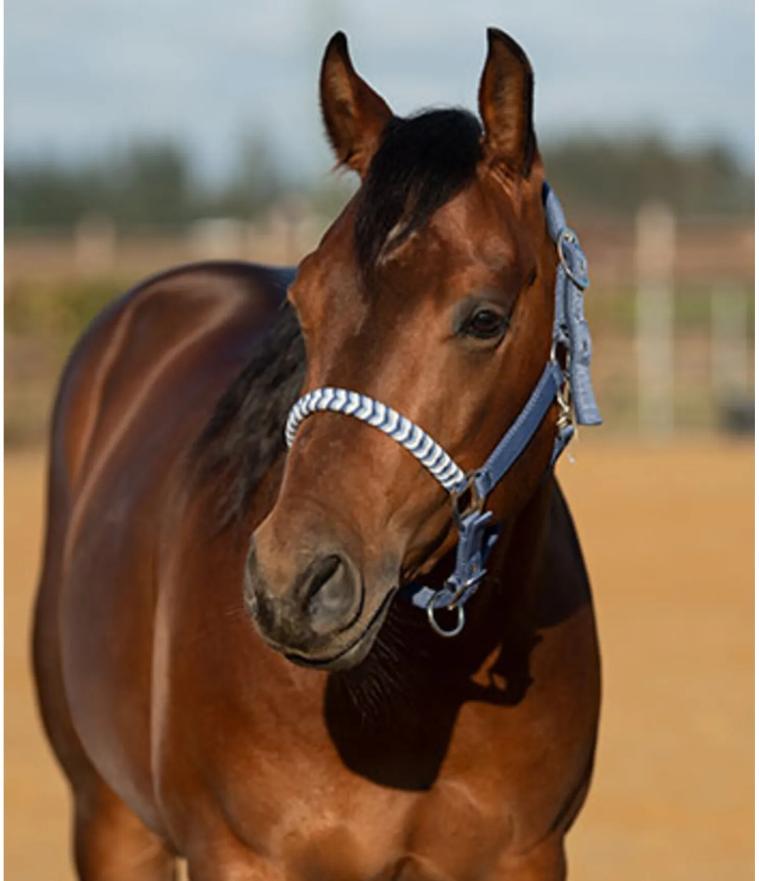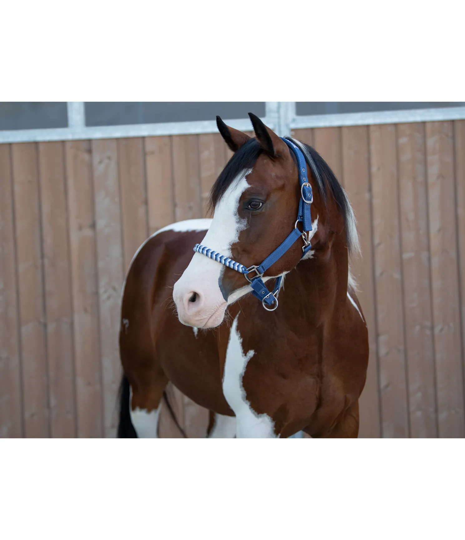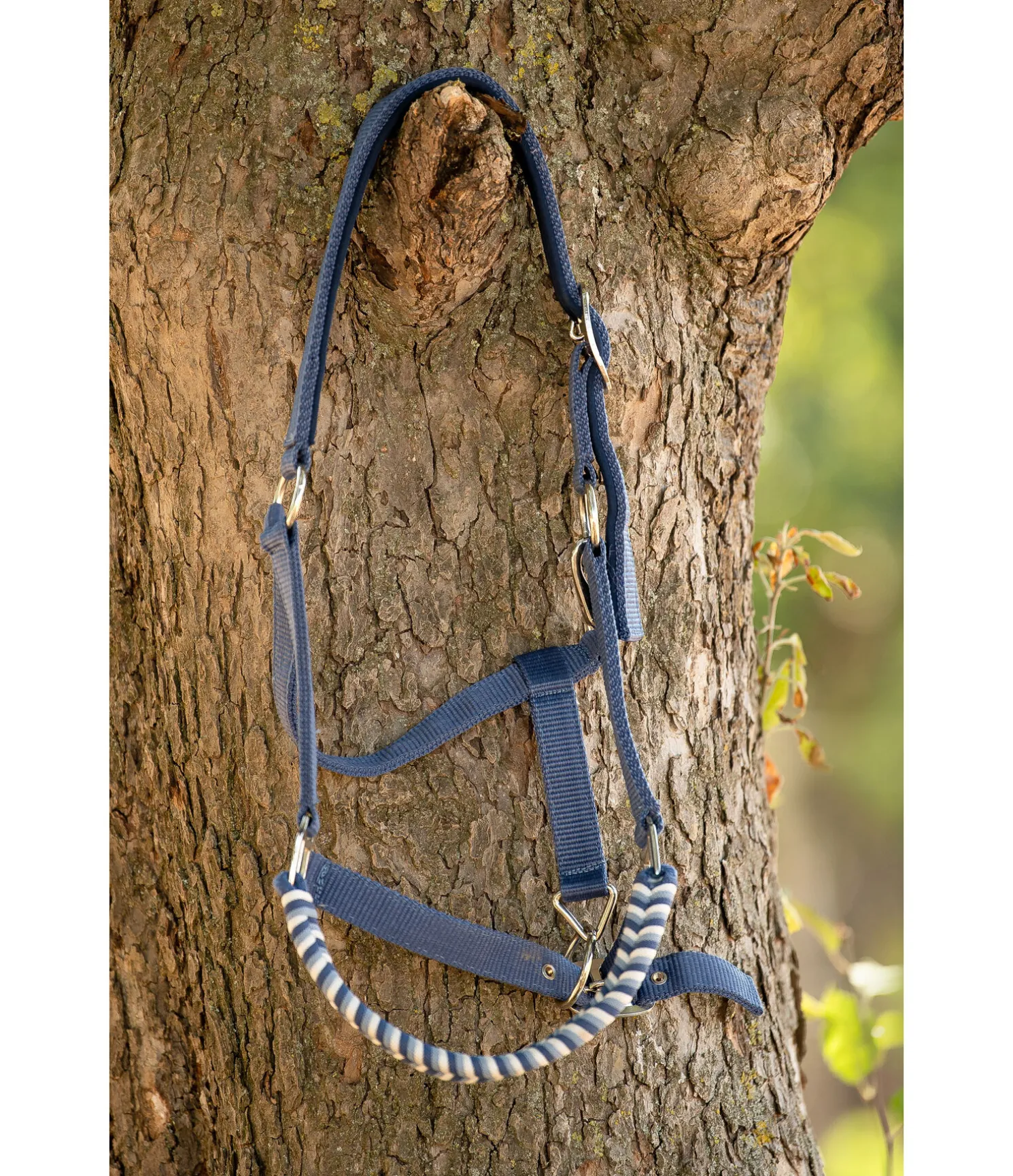 Licol exceptionnel avec muserolle tressée dans un look tricolore et broderie logo sur la têtière. Muserolle et têtière réglables. Têtière avec doublure moelleuse en caoutchouc chloroprène.