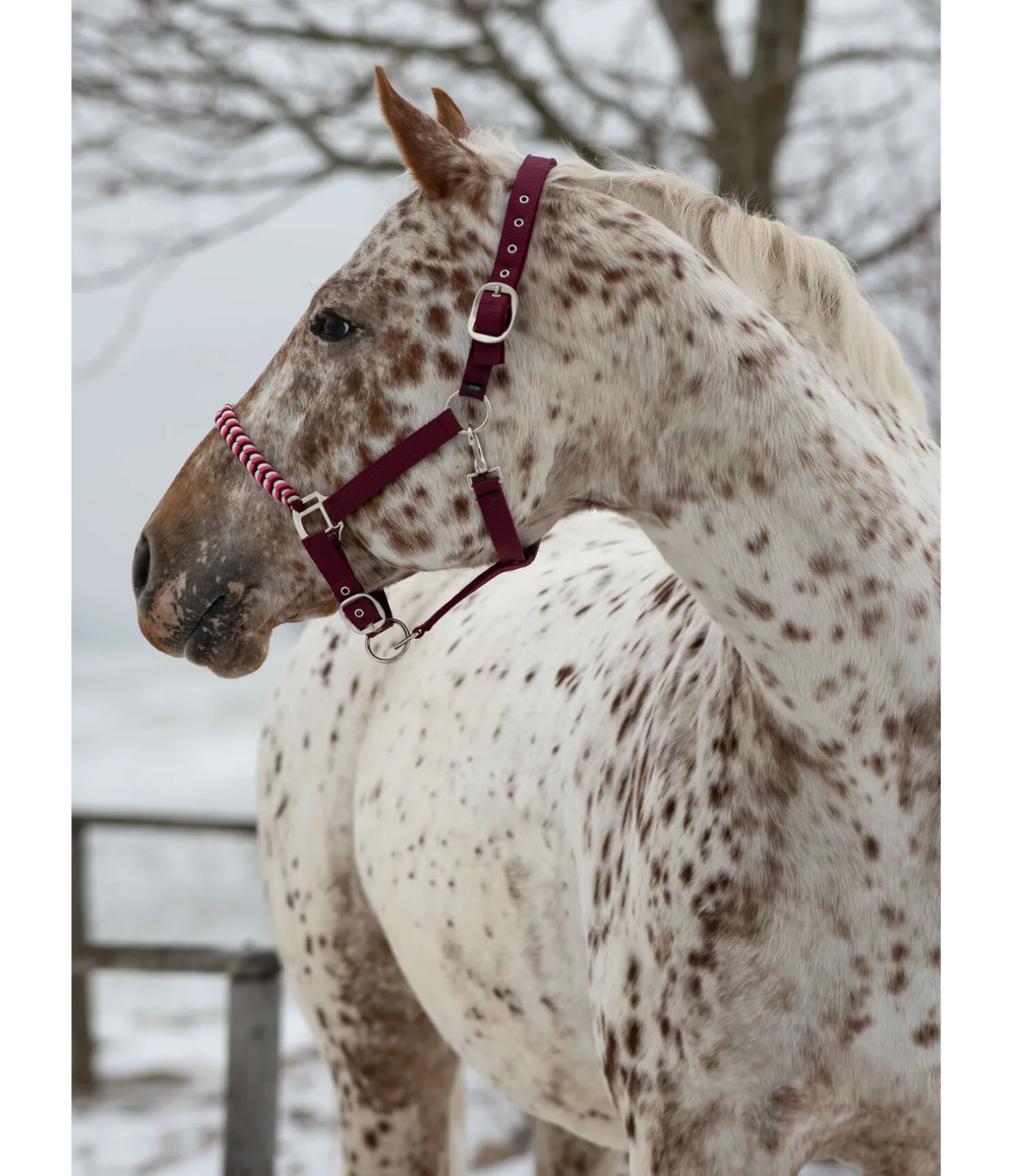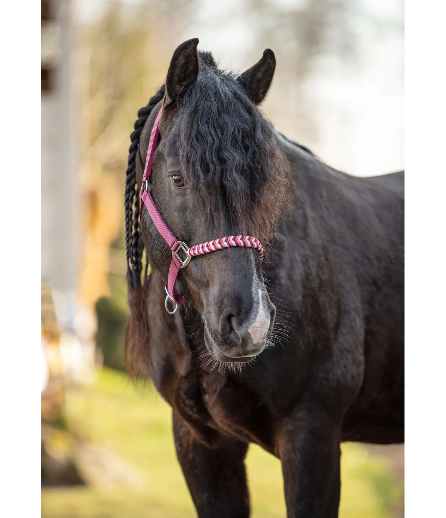 Licol exceptionnel avec muserolle tressée dans un look tricolore et broderie logo sur la têtière. Muserolle et têtière réglables. Têtière avec doublure moelleuse en caoutchouc chloroprène.