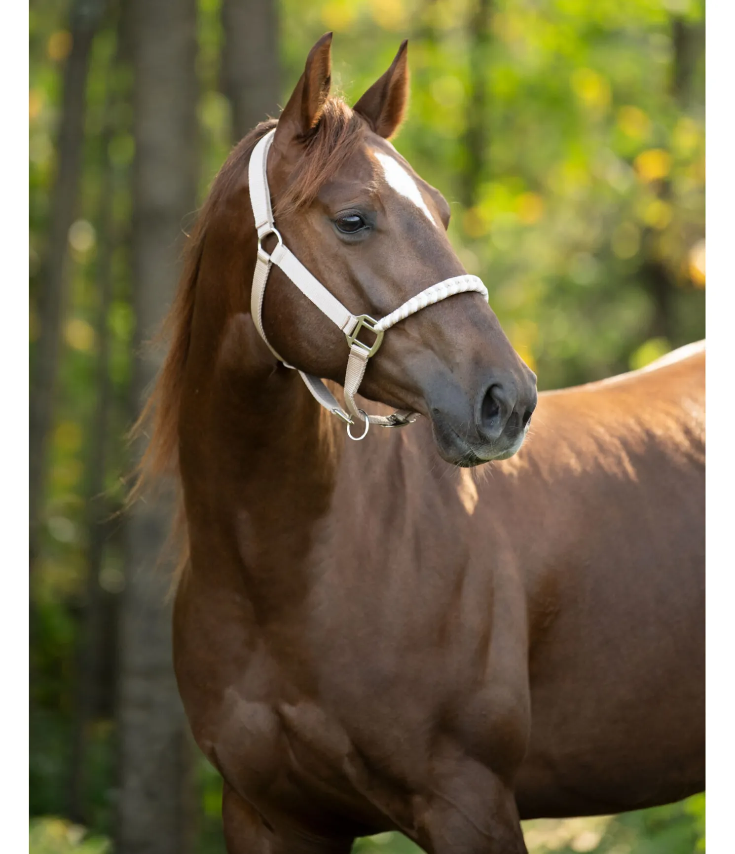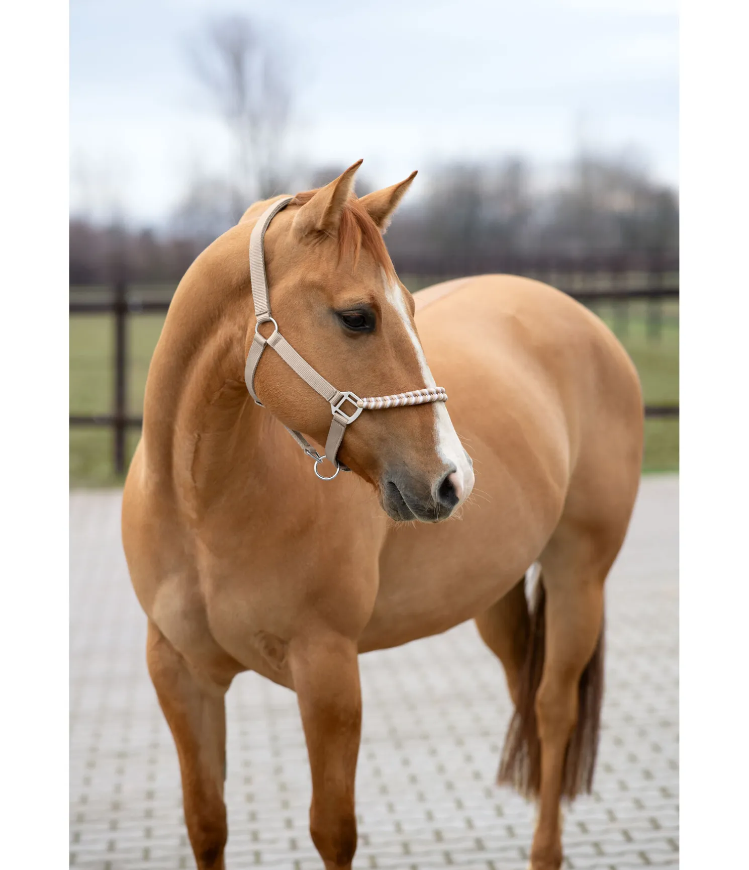Licol exceptionnel avec muserolle tressée dans un look tricolore et broderie logo sur la têtière. Muserolle et têtière réglables. Têtière avec doublure moelleuse en caoutchouc chloroprène.