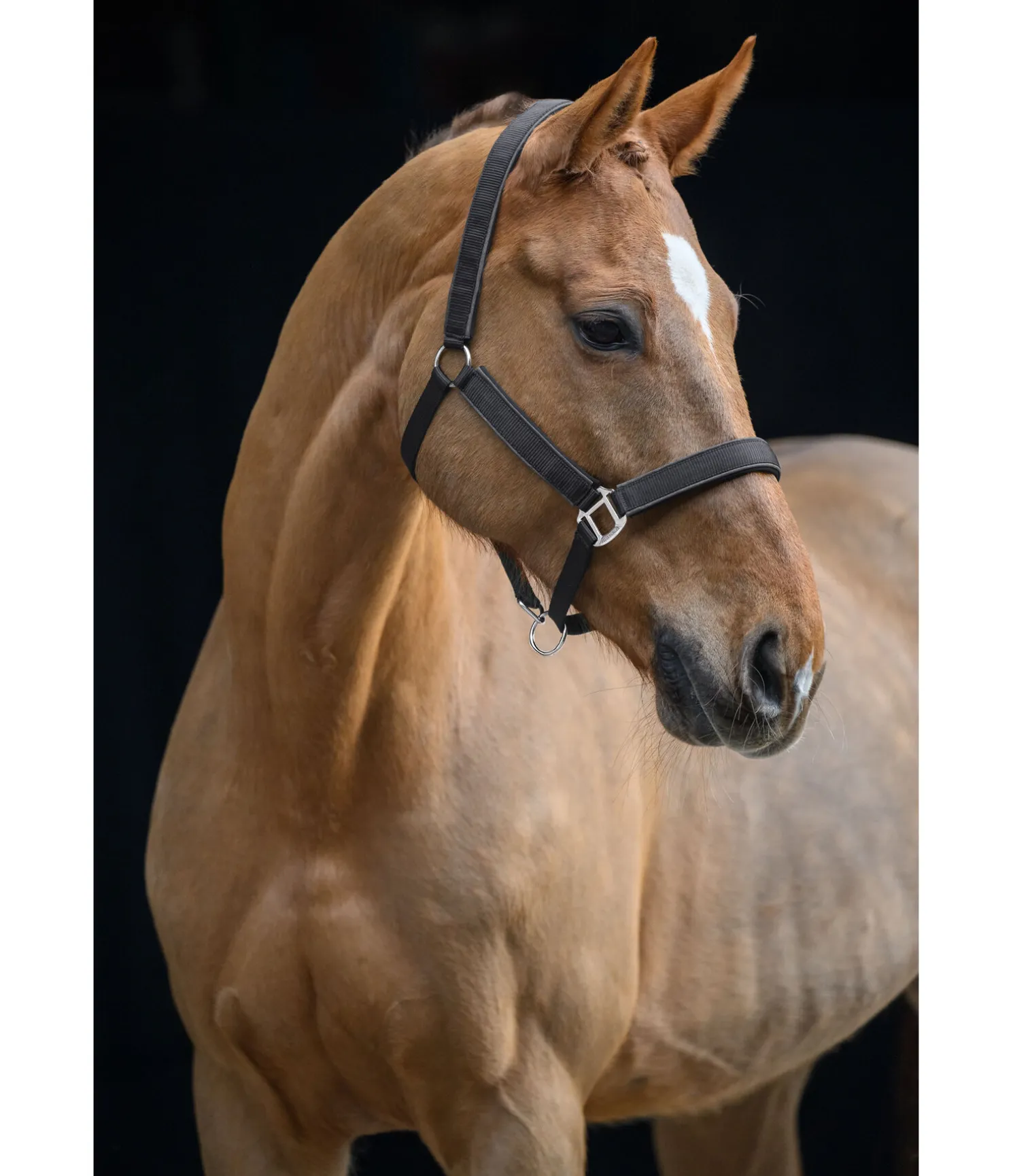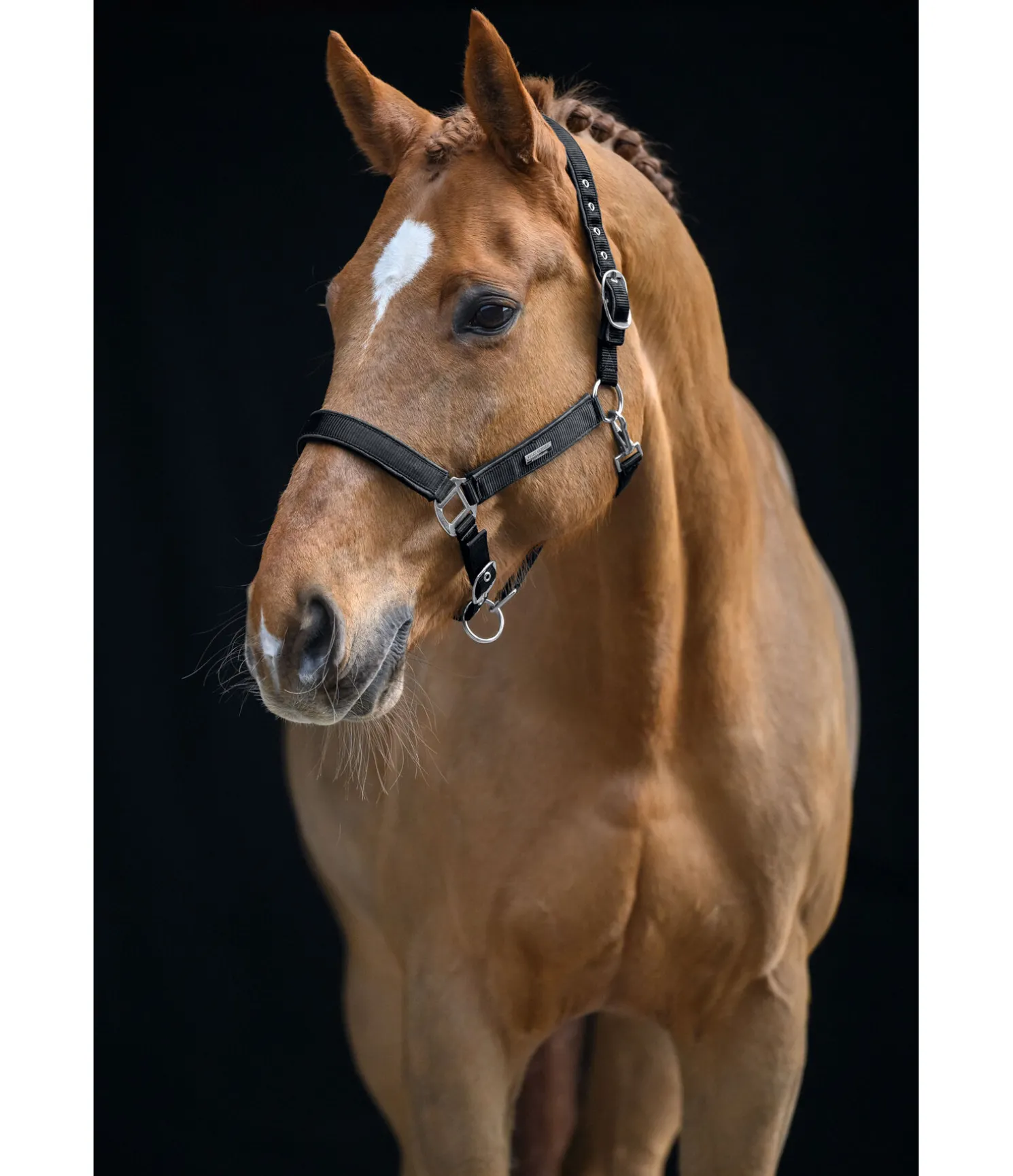 Licol chic avec passepoil scintillant et bouclerie de couleur assortie. Têtière, muserolle et montants avec doublure douce en caoutchouc chloroprène pour un confort maximal. Plaque métallique discrète avec logo gravé sur le montant gauche. Têtière et muserolle réglables. 100 % polypropylène.