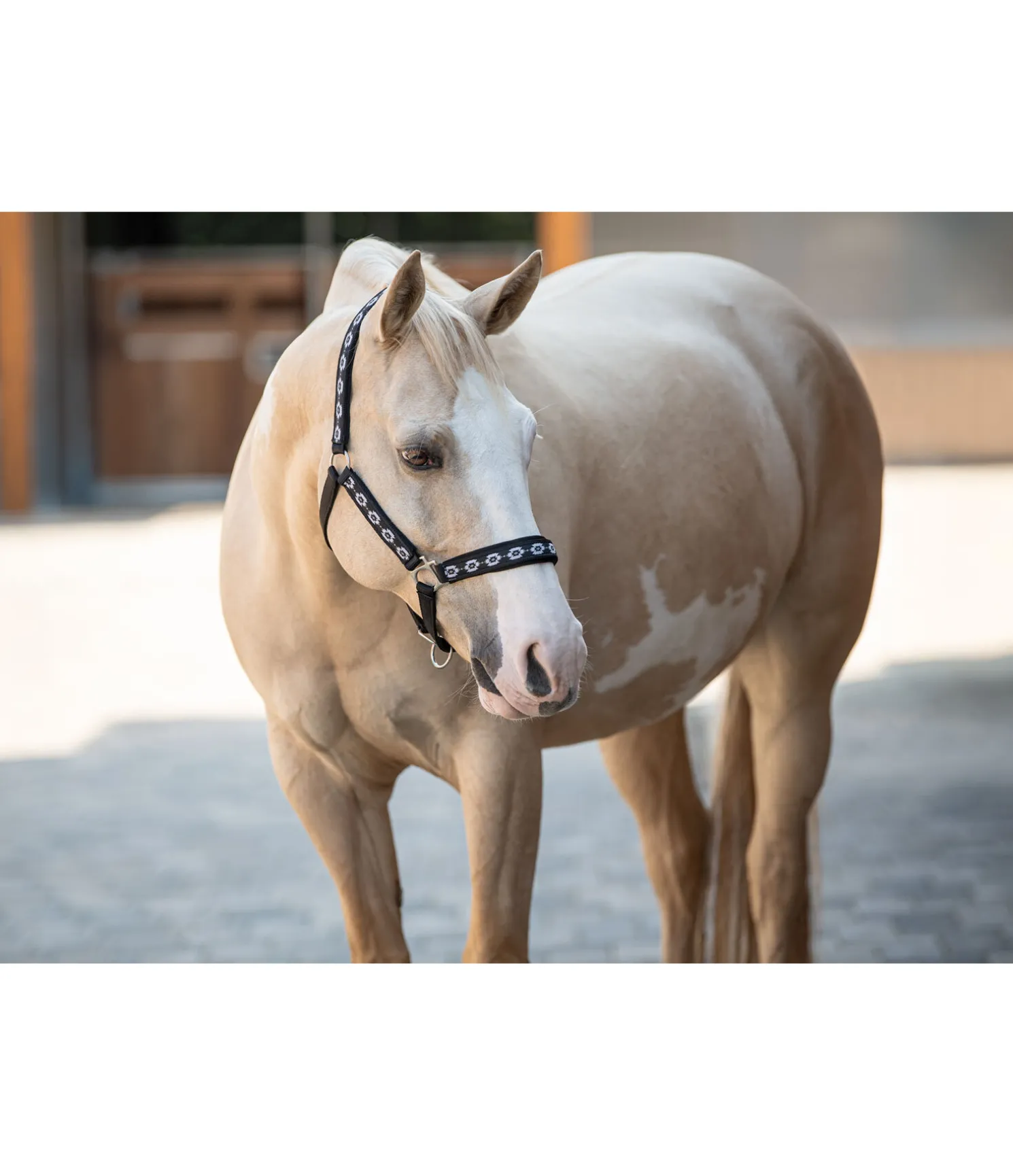 Licol avec motif imprimé. La muserolle, les montants et la têtière sont doublés de caoutchouc chloroprène souple. Réglable au niveau de la têtière et de la muserolle. Licol 100 % polypropylène, rembourrage 100 % caoutchouc chloroprène.