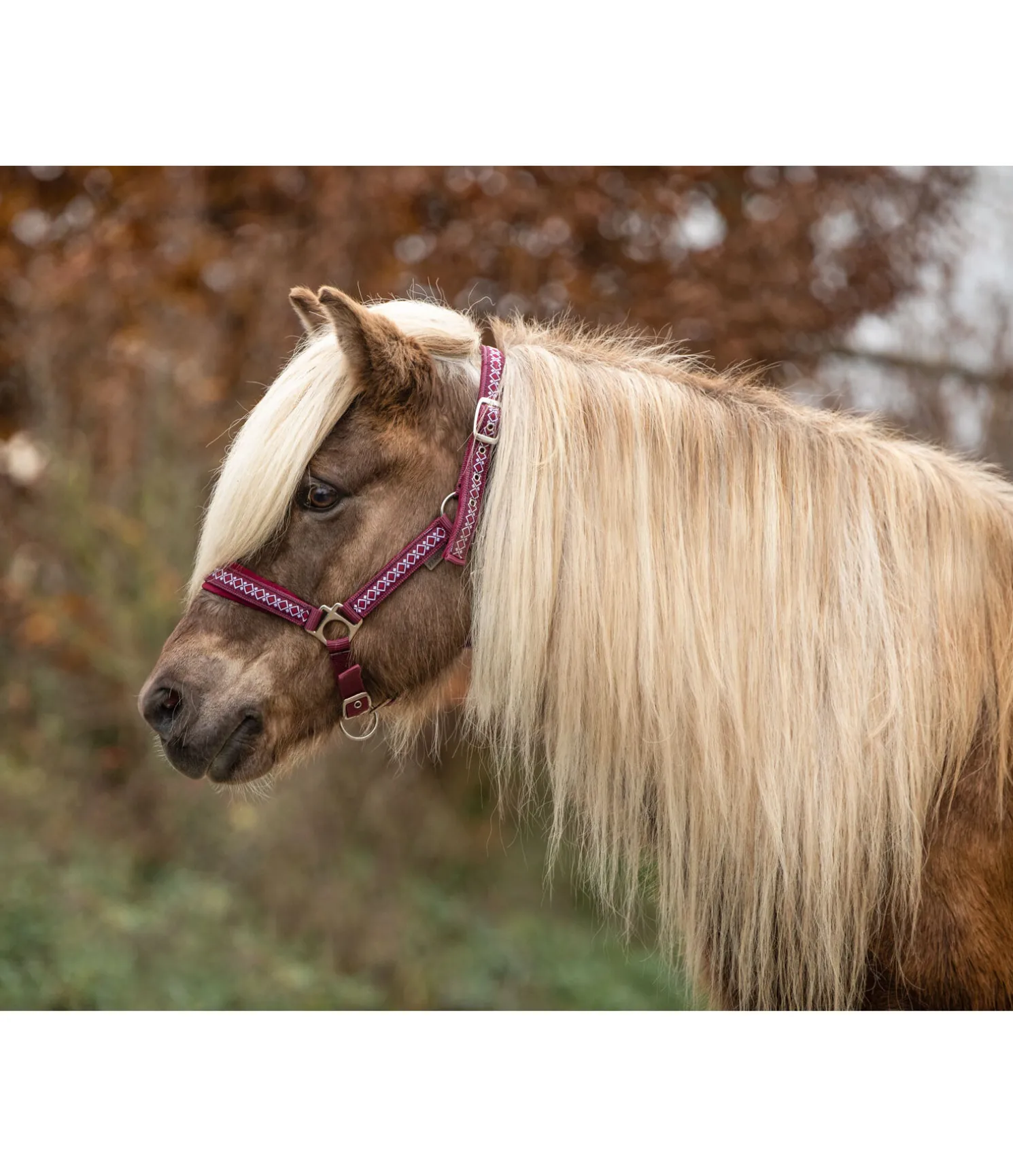 Licol avec motif nordique, pas uniquement réservé aux poneys islandais. Têtière, montants et muserolle avec doublure moelleuse. Têtière et muserolle réglables. Licol 100 % polypropylène, doublure 100 % polyester