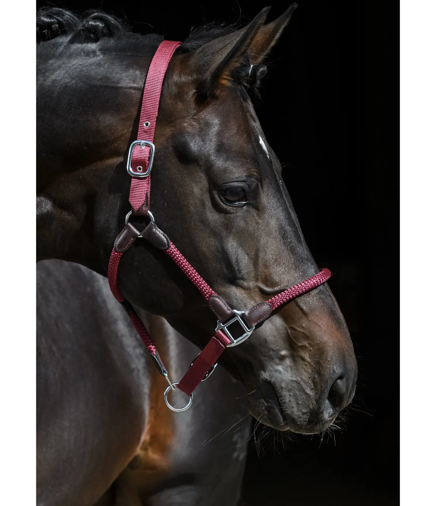 Licol exceptionnel avec corde tressée et extrêmités en cuir, qui lui confèrent un look particulièrement soigné. Assorti à la longe Kate (440 543 et 440 686). Muserolle et têtière réglables. Bouclerie argentée. Licol 100 % polypropylène, doublure 100 % caoutchouc chloroprène.