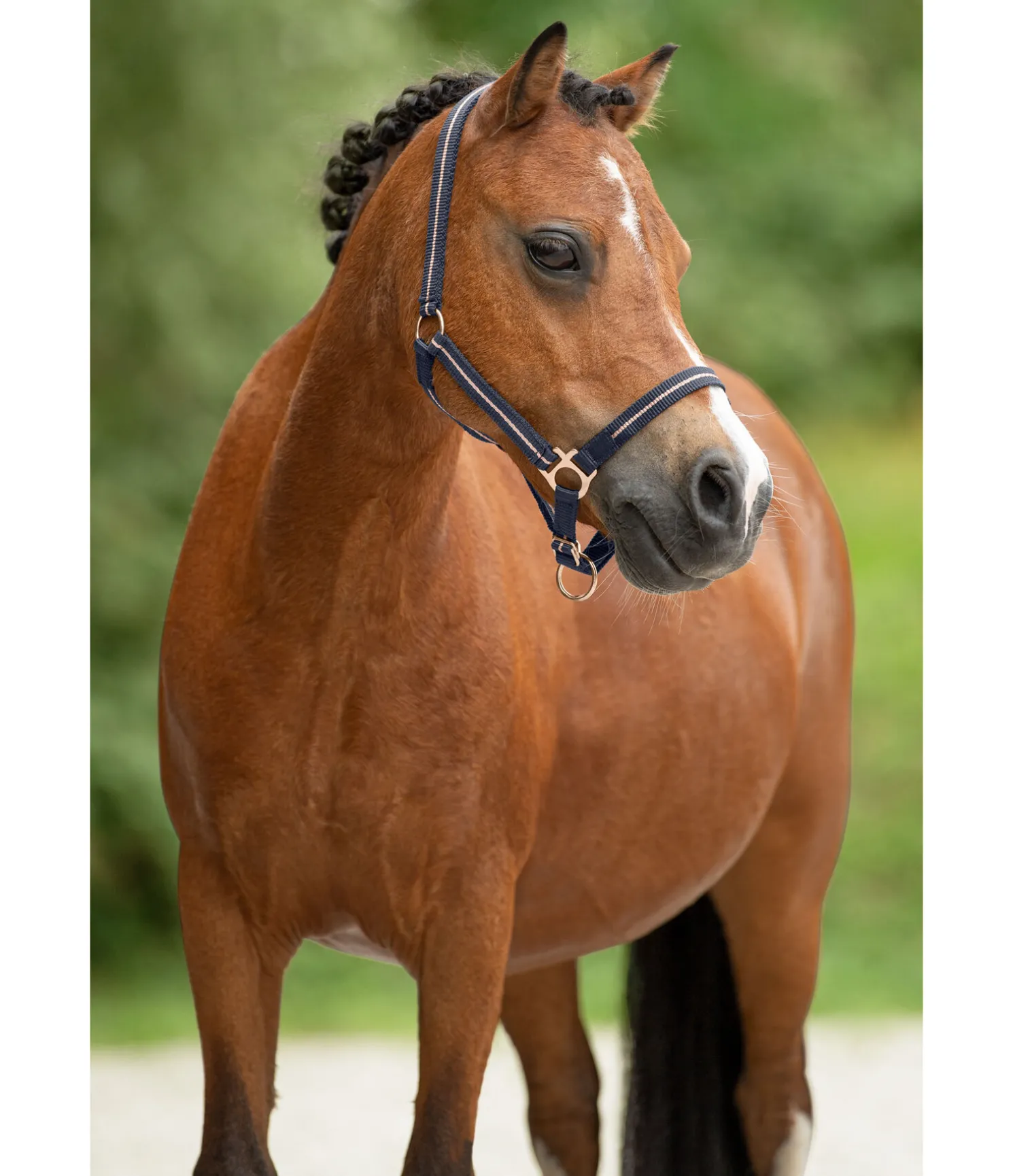 Licol tendance avec fil métallisé scintillant et bouclerie assortie. Têtière, muserolle et sous-gorge réglables en continu. 100 % polypropylène.