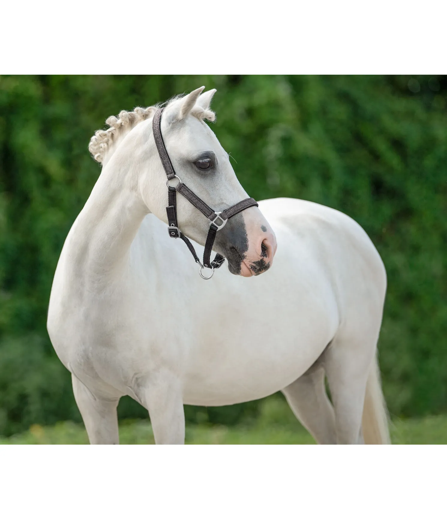 Licol pailleté étincelant avec doublure douce en caoutchouc chloroprène sur la têtière, la muserolle et les montants. Têtière et muserolle faciles à régler. Licol 100 % polypropylène.