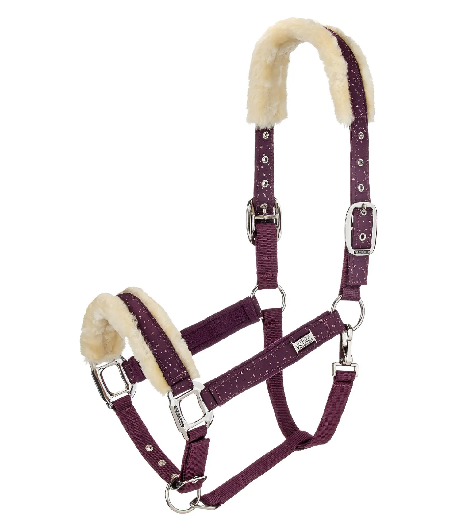 Magnifique licol avec revêtement satiné orné de fragments scintillants et bouclerie de couleur assortie. Têtière et muserolle avec doublure douce en polaire Teddy. Petite plaque élégante avec logo gravé sur chaque montant. Têtière doublement réglable et muserolle réglable. Licol 100 % polypropylène, doublure et revêtement 100 % polyester.