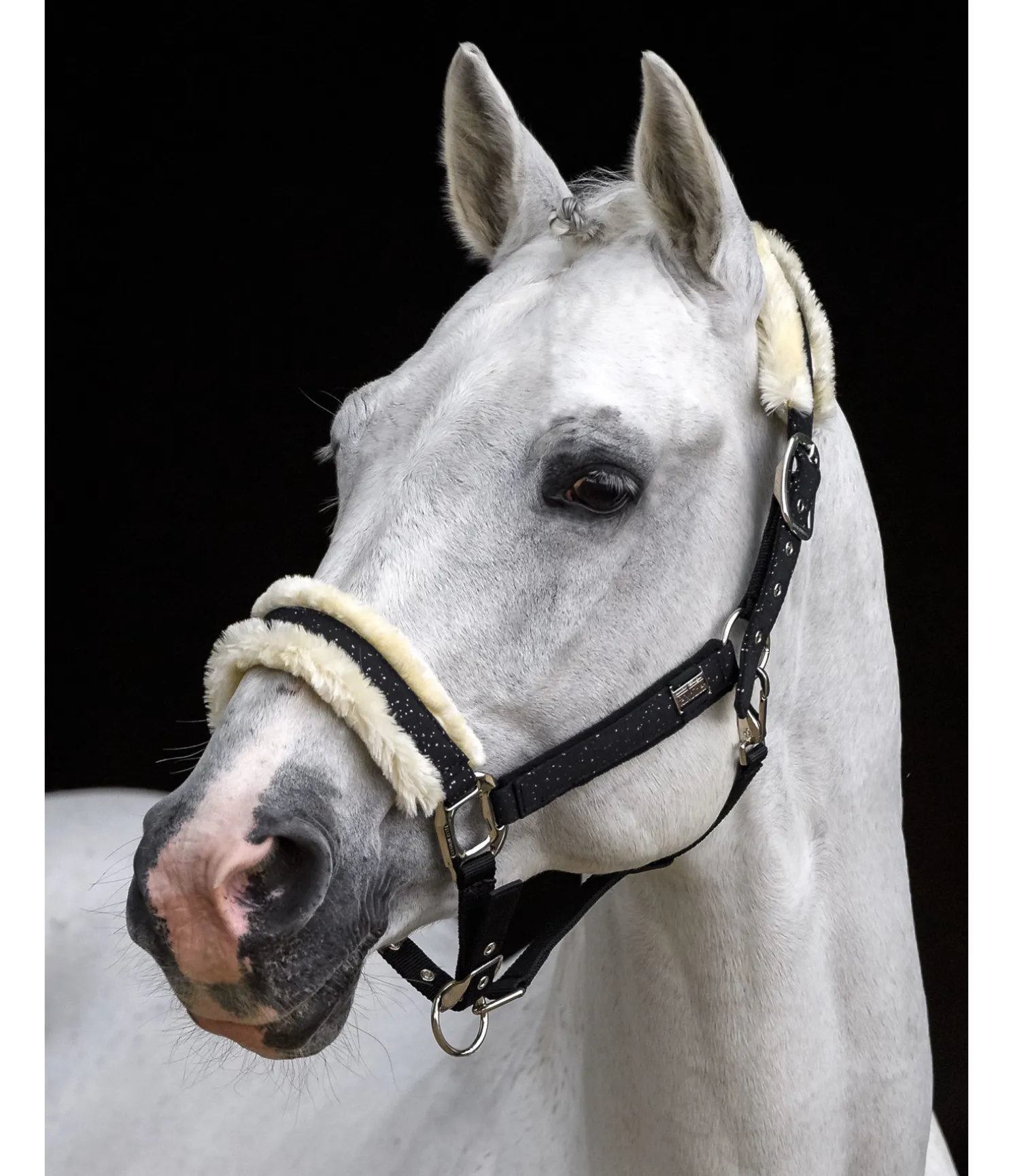 Magnifique licol avec revêtement satiné orné de fragments scintillants et bouclerie de couleur assortie. Têtière et muserolle avec doublure douce en polaire Teddy. Petite plaque élégante avec logo gravé sur chaque montant. Têtière doublement réglable et muserolle réglable. Licol 100 % polypropylène, doublure et revêtement 100 % polyester.