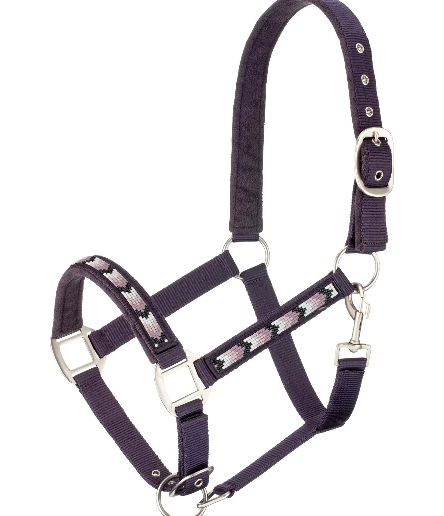 Licol en nylon avec décoration sophistiquée en perles. Rembourrage doux sur la muserolle et la têtière. Muserolle et têtière réglables.