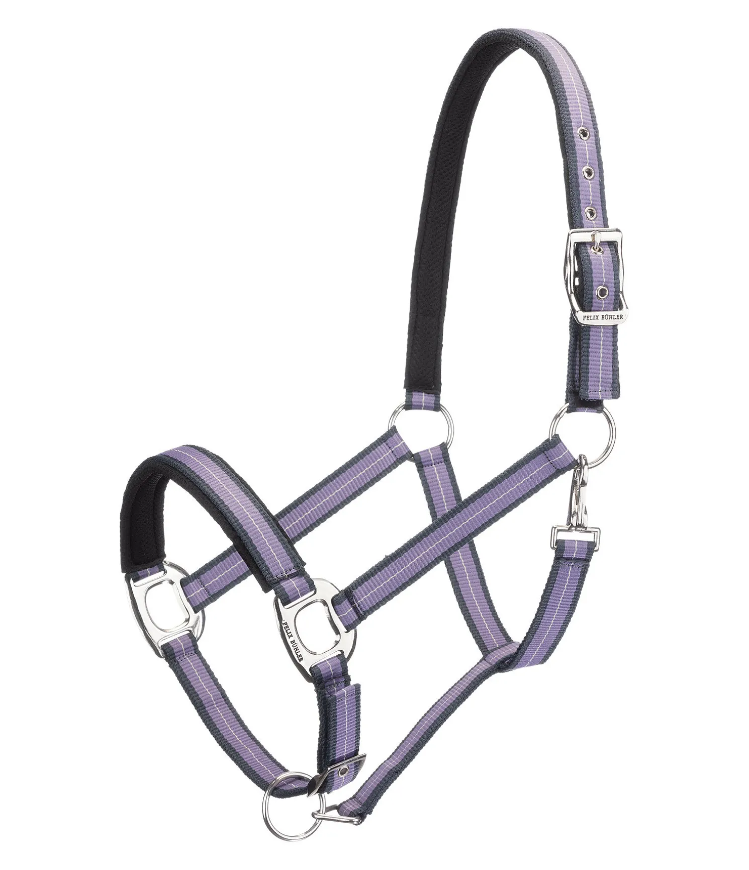 Licol rayé dans un look sportif avec doublure respirante en mesh sur la têtière et la muserolle. Muserolle et têtière réglables. Licol 100 % polypropylène.