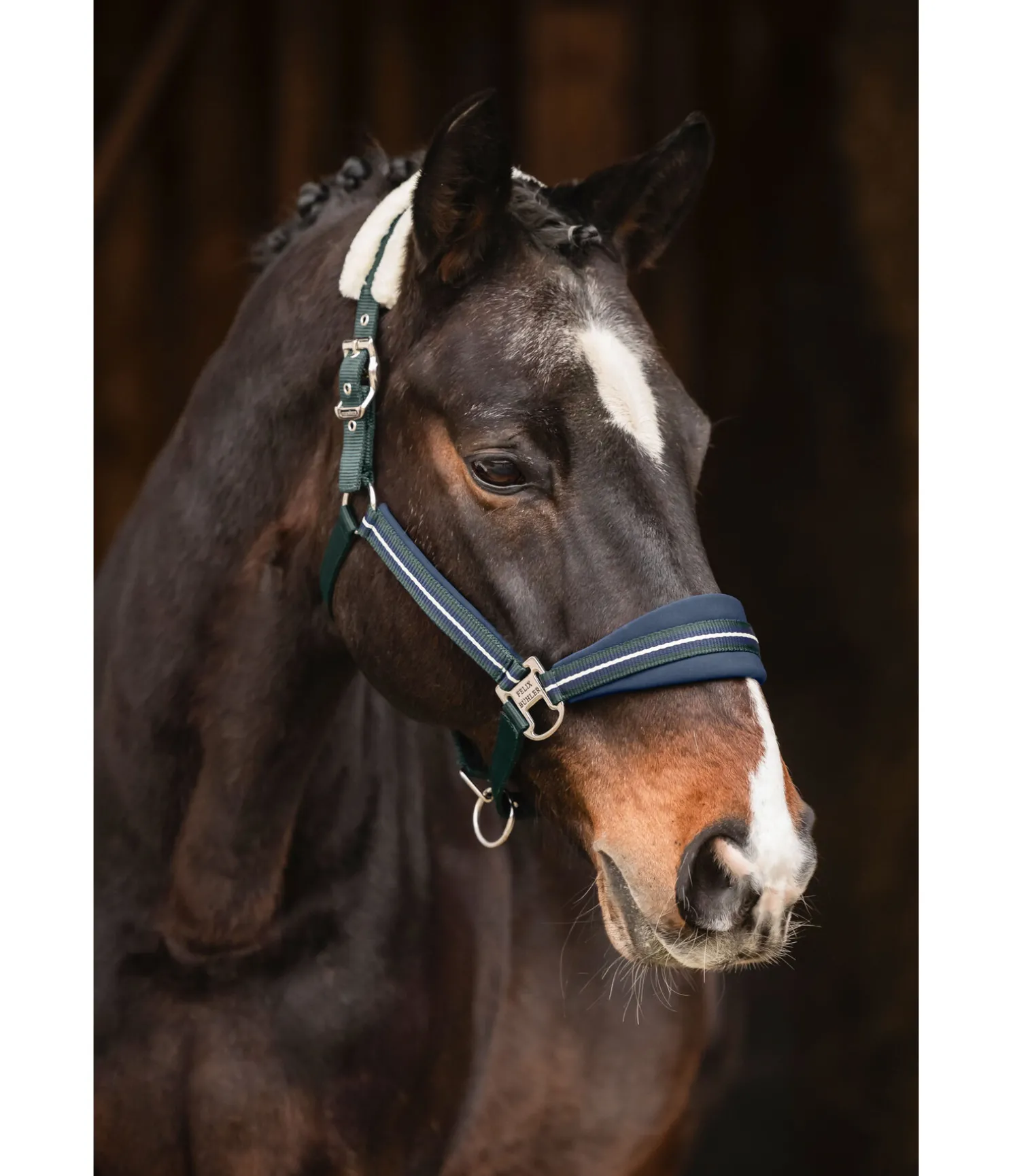 Licol avec têtière doublée en polaire Teddy douce. Sportswear. Muserolle et montants doublés en caoutchouc-chloroprène doux. Design tendance à rayures tricolore orné d’une petite plaque avec logo. Têtière doublement réglable et muserolle réglable. Bouclerie en métal de couleur assortie. Licol 100 % polypropylène, polaire Teddy 100 % polyester.
