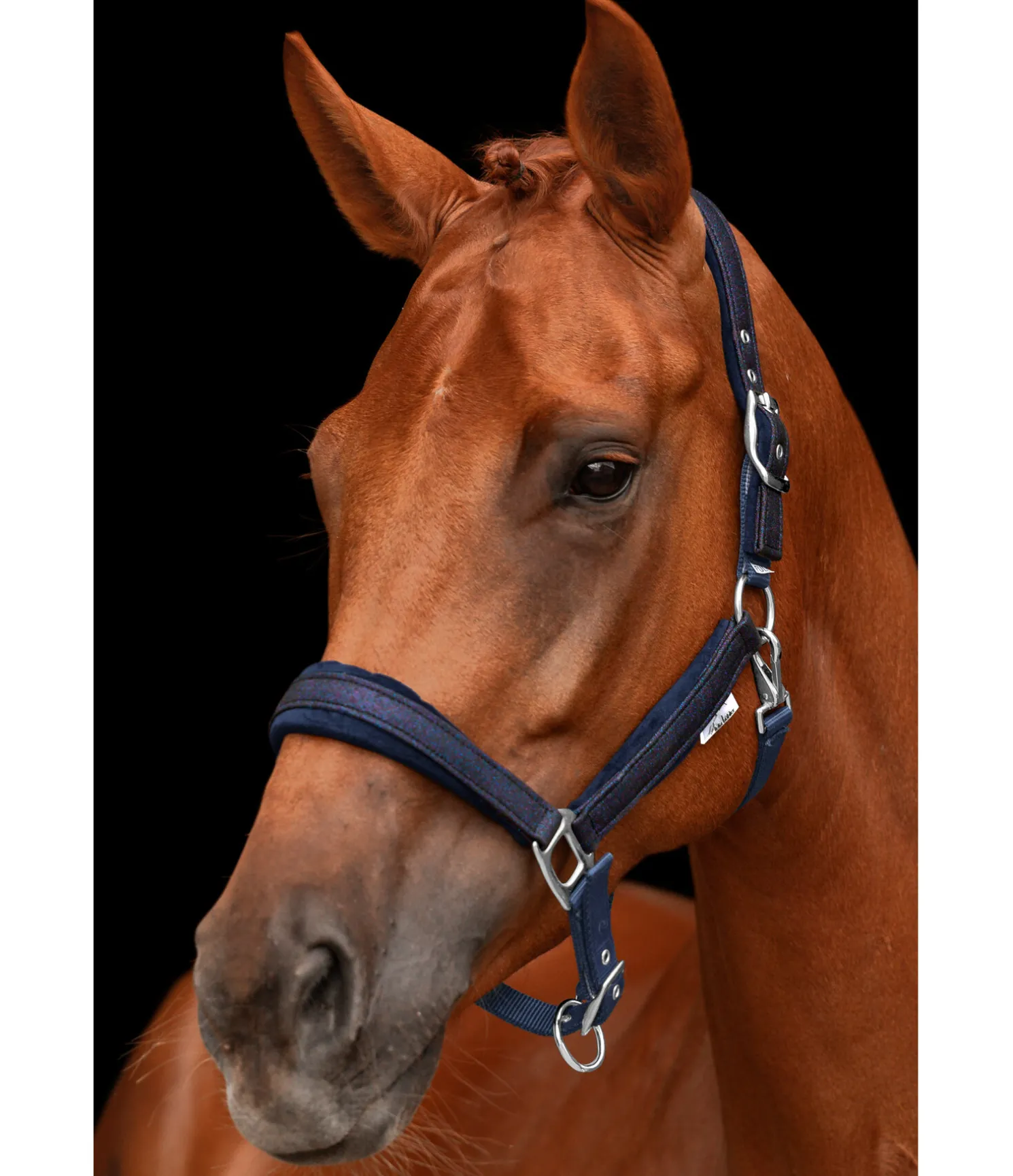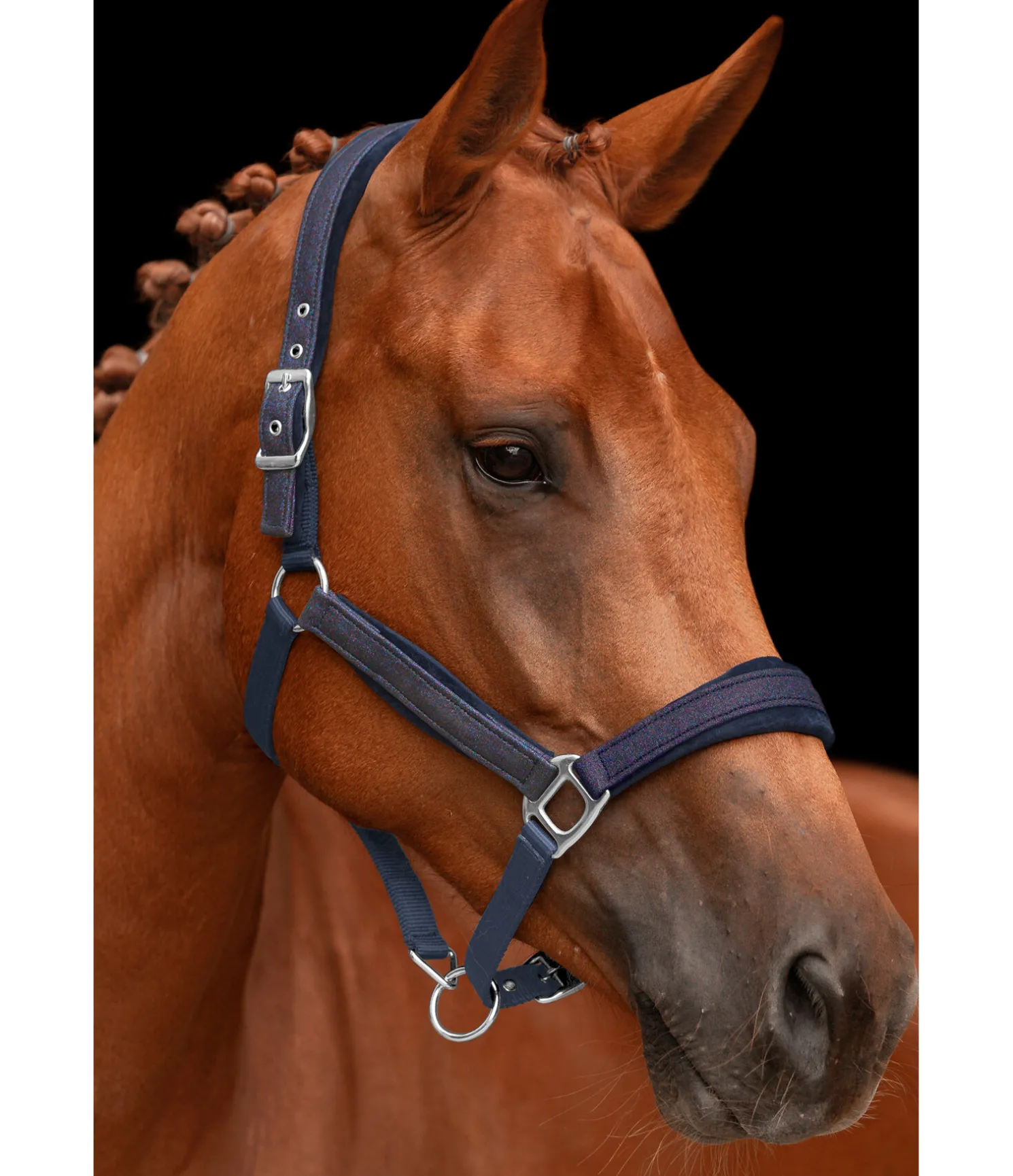 Licol pailleté. Doublure douce effet velours au niveau de la têtière, de la muserolle et des montants. Têtière réglable sur chaque côté. Muserolle réglable. Bouclerie de couleur assortie. 100 % polypropylène.