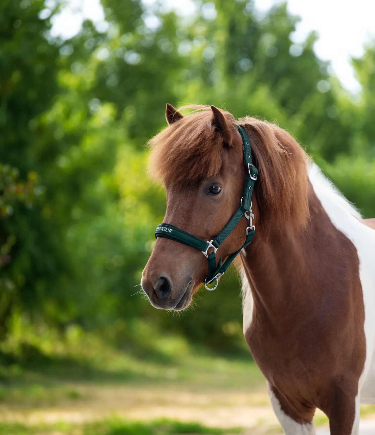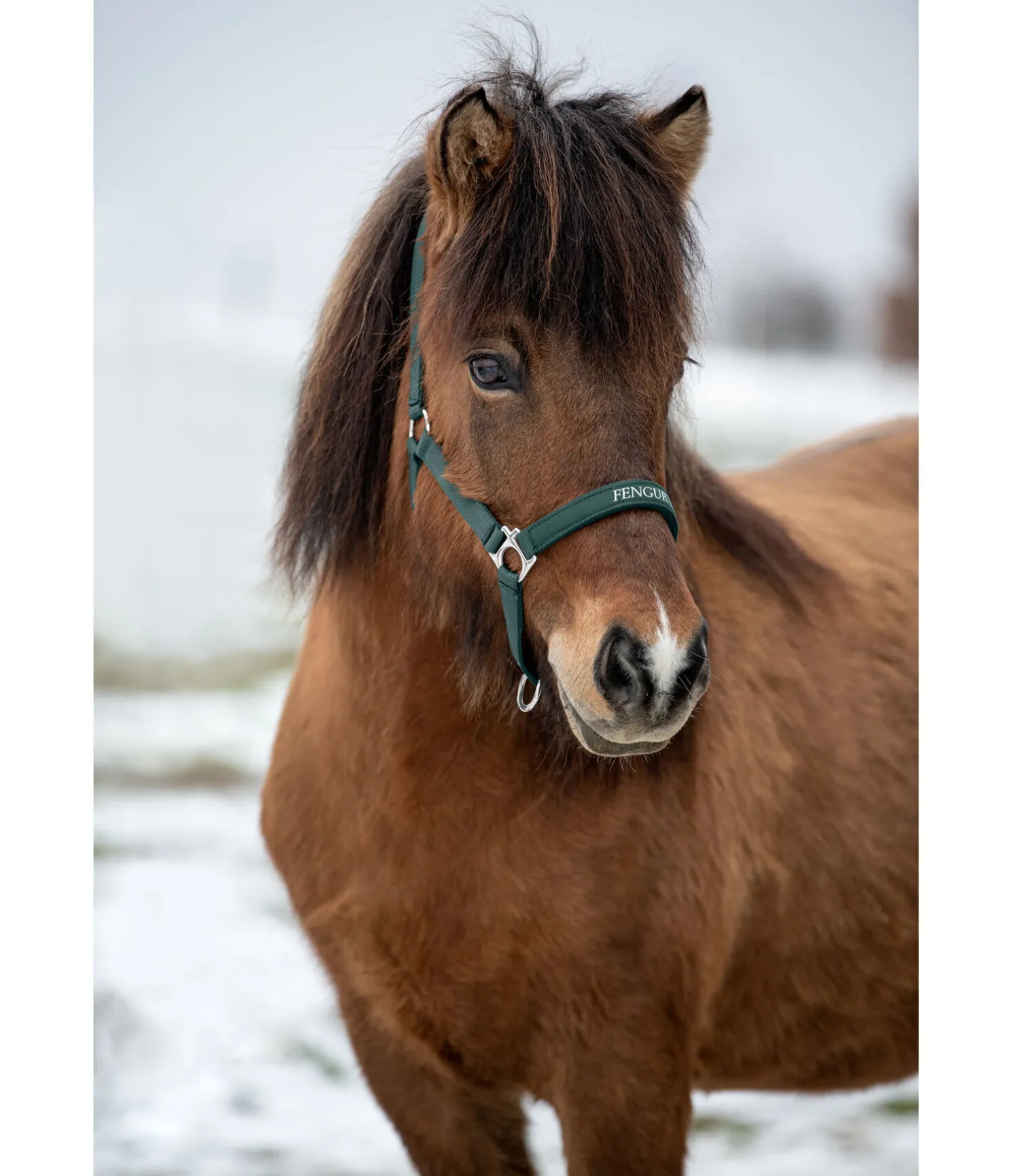 Licol élégant et sportif avec imprimé FENGUR argenté sur la muserolle. Têtière et muserolle avec doublure moelleuse en caoutchouc-chloroprène, réglables pour un ajustement optimal. Bouclerie argentée. 100 % polypropylène.