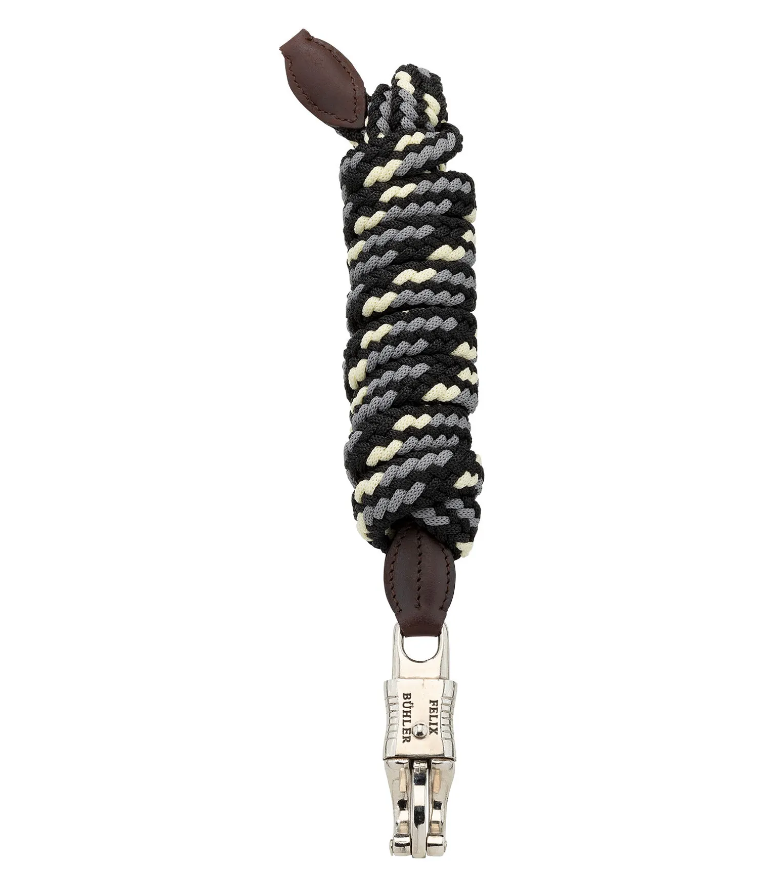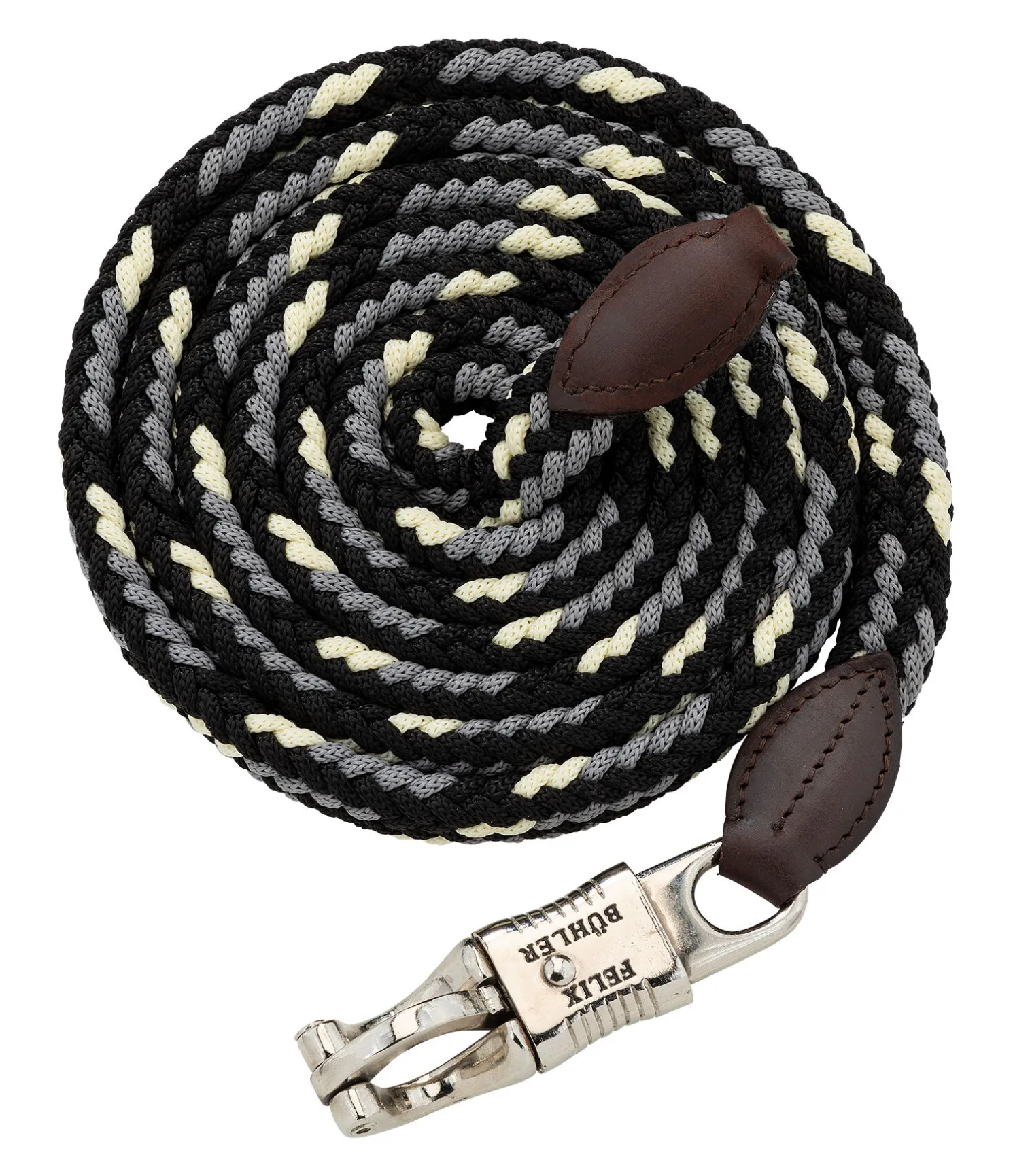 Longe tressée très résistante avec élégants embouts en cuir et mousqueton anti-panique. Assortie au licol 310040. Bouclerie argentée. 2 m. 100 % polypropylène.