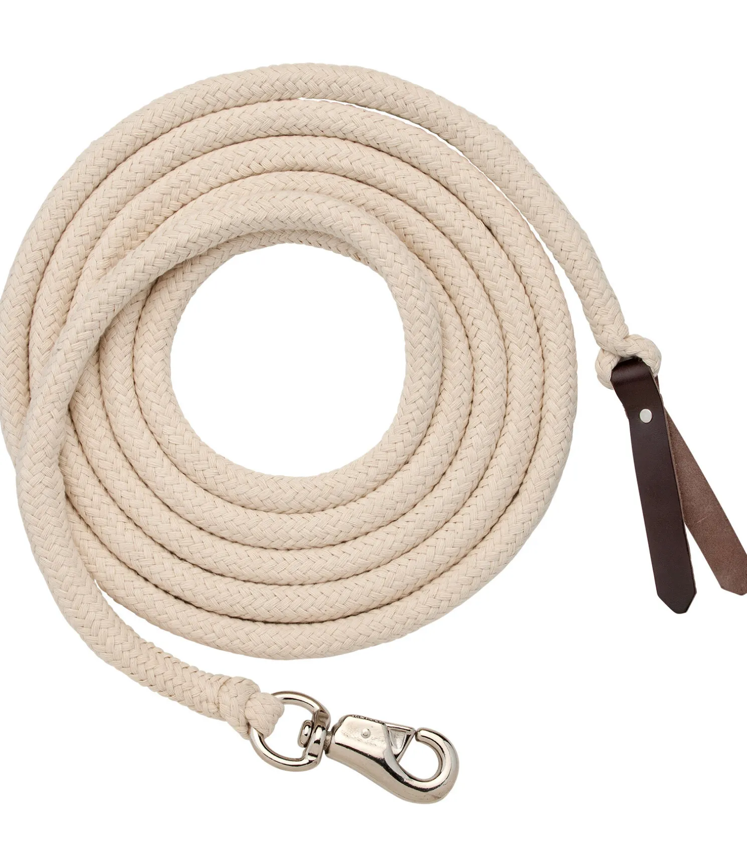 Très résistante grâce à l’épais coeur en polyester. Gaine en coton naturel anti-dérapant. Grâce au poids du bullsnap en laiton, qui peut s’ouvrir vers l’extérieur, les indications transmises au cheval sont encore plus claires. Avec embout en cuir. Disponible en 4 m.