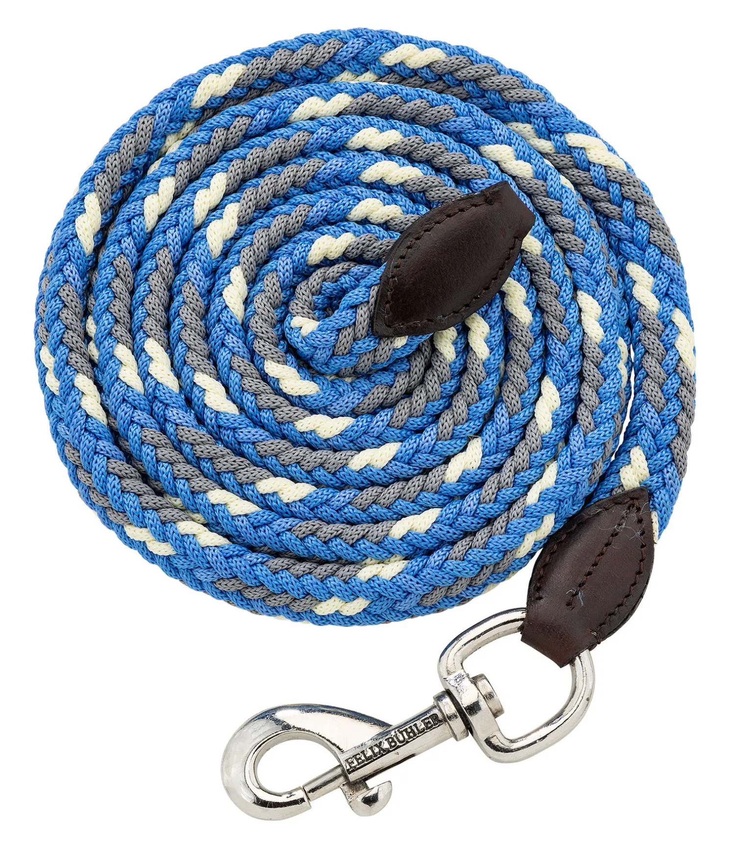 Longe tressée ronde très résistante avec élégants embouts en cuir et mousqueton. Assortie au licol 310040. Bouclerie argentée. 2 m. 100 % polypropylène.