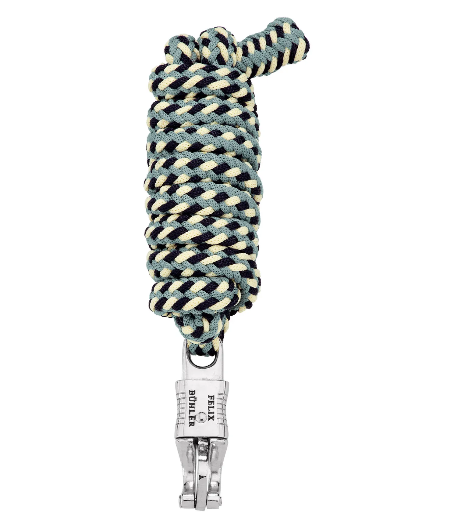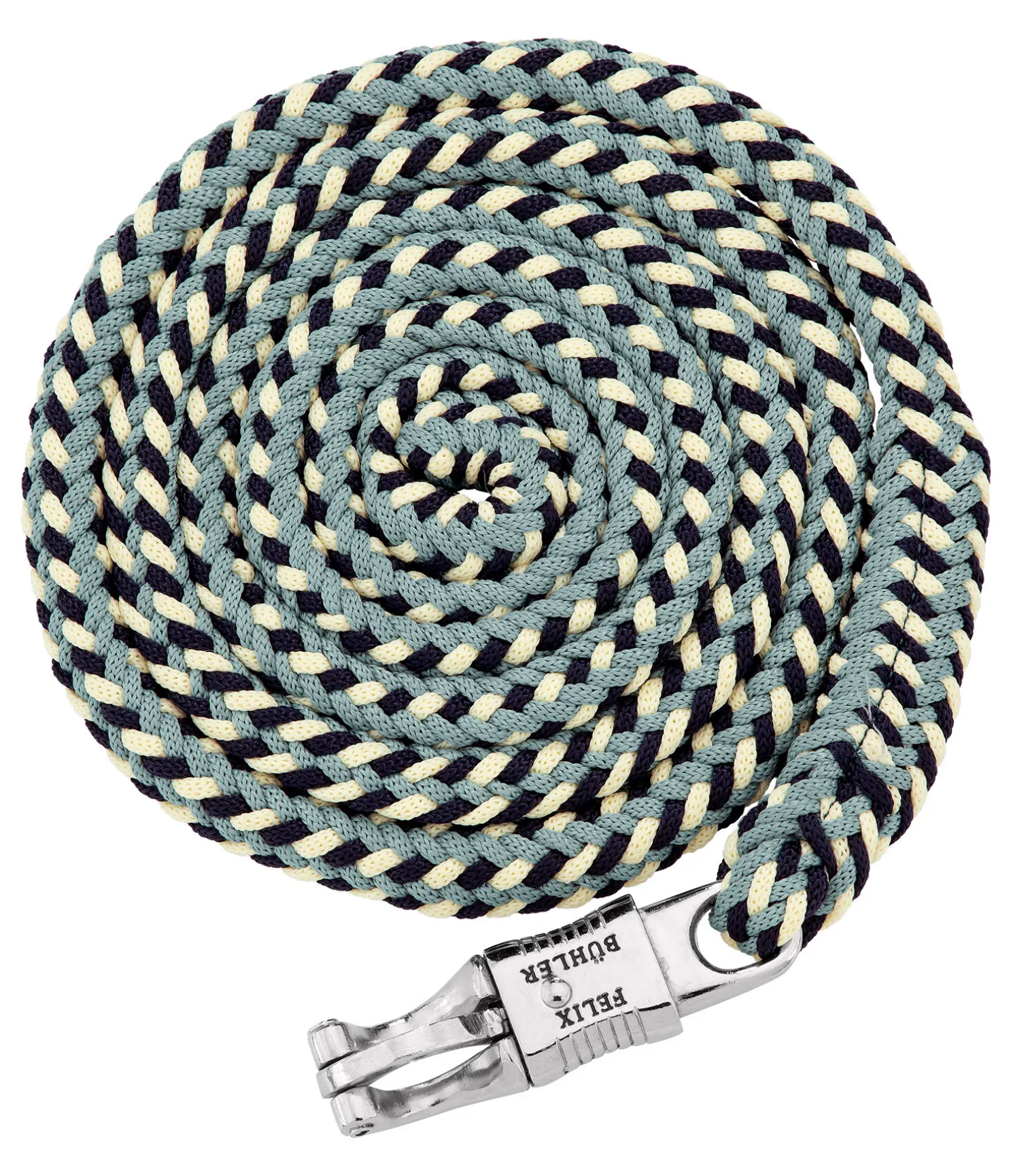 Longe tressée tricolore solide avec mousqueton anti-panique. 2 m. 100 % polyester. Assortie au licol 310056.