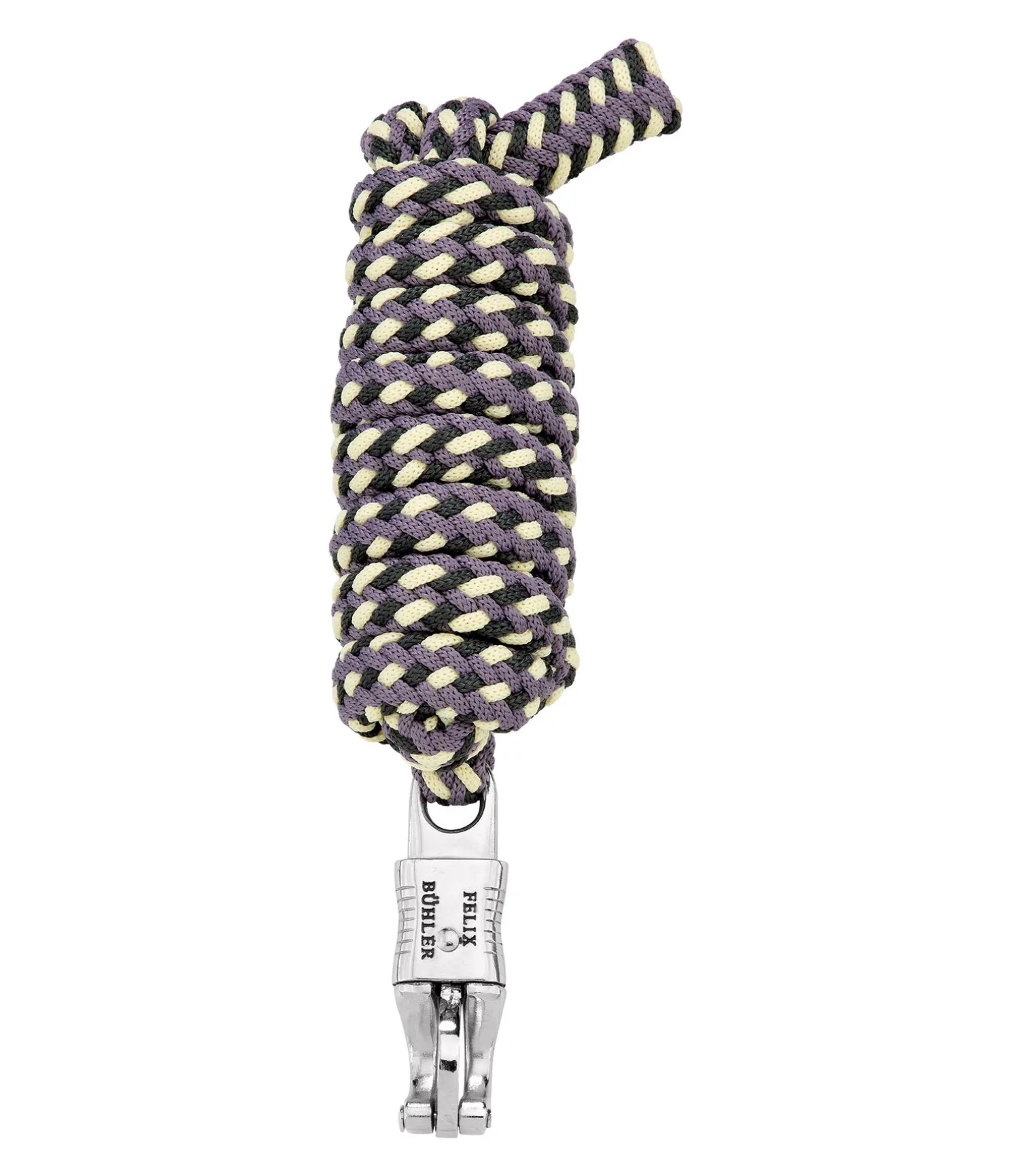 Longe tressée tricolore solide avec mousqueton anti-panique. 2 m. 100 % polyester. Assortie au licol 310056.