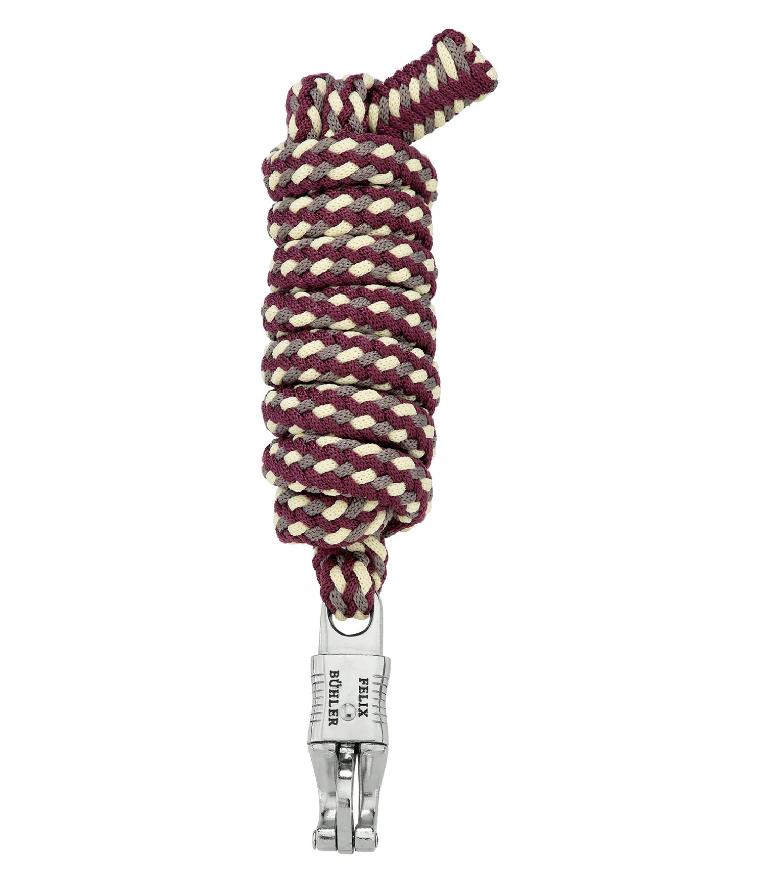 Longe tressée tricolore solide avec mousqueton anti-panique. 2 m. 100 % polyester. Assortie au licol 310056.
