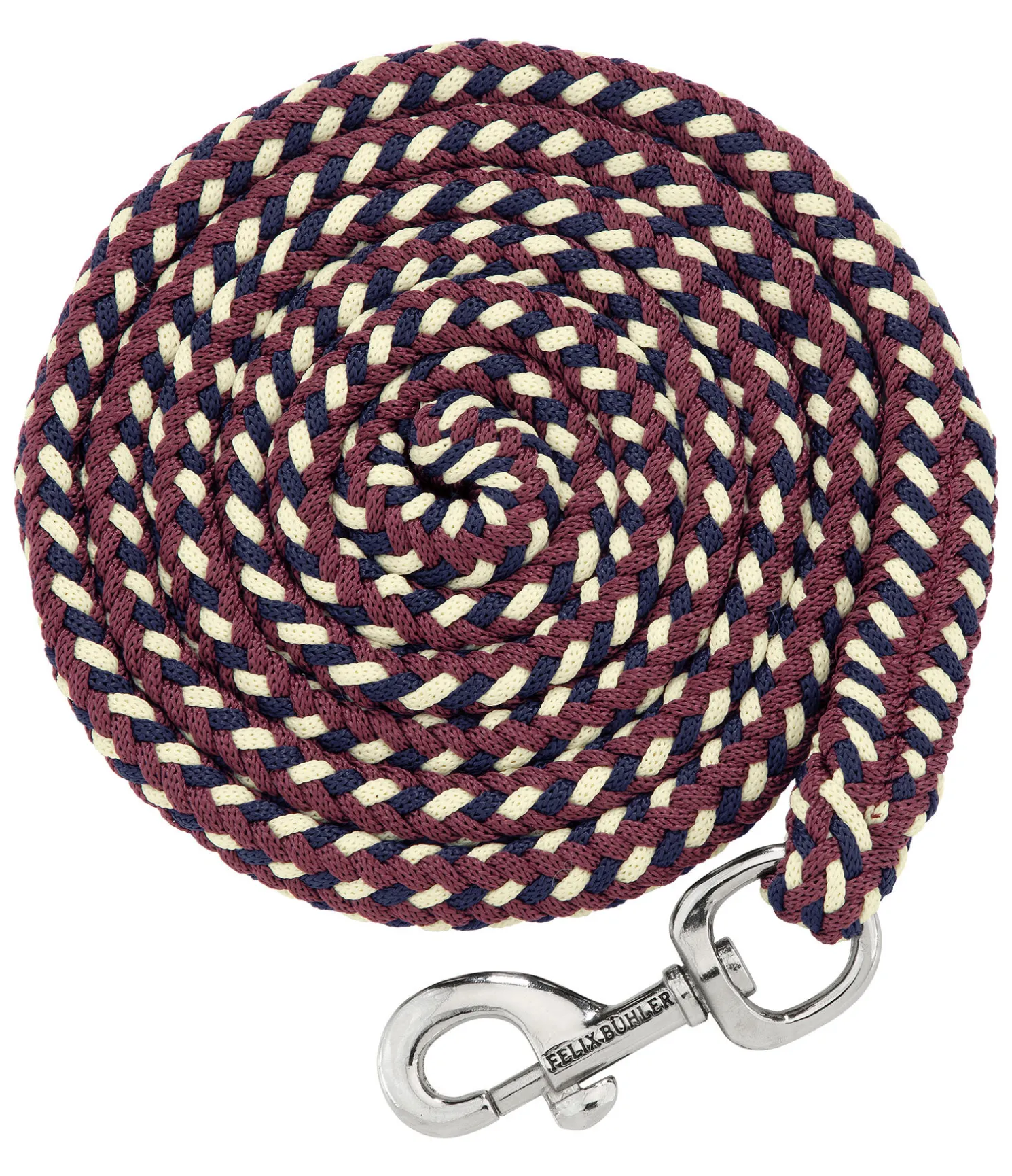 Longe tressée tricolore solide avec mousqueton. 2 m. 100 % polyester. Assortie au licol 310056.