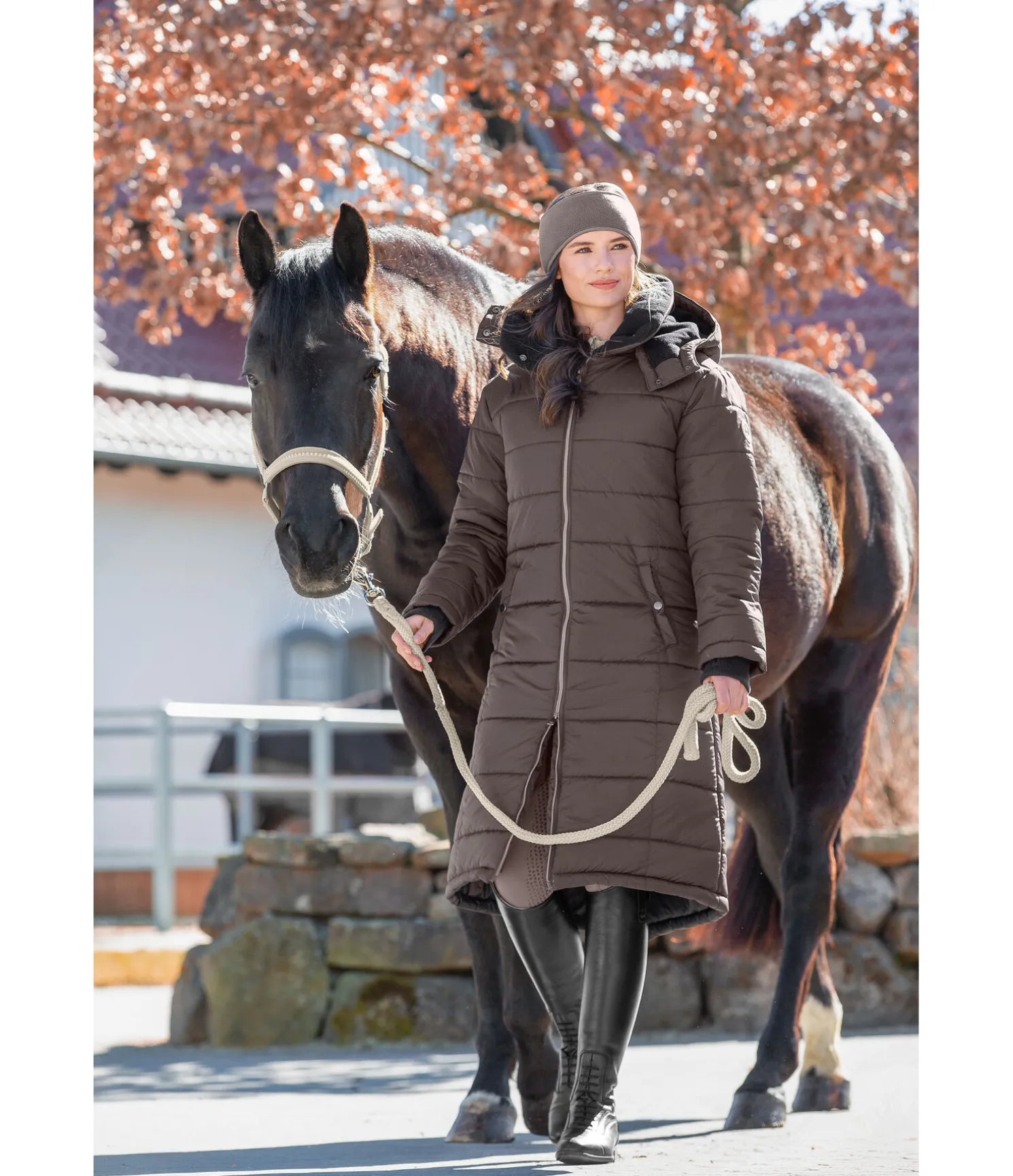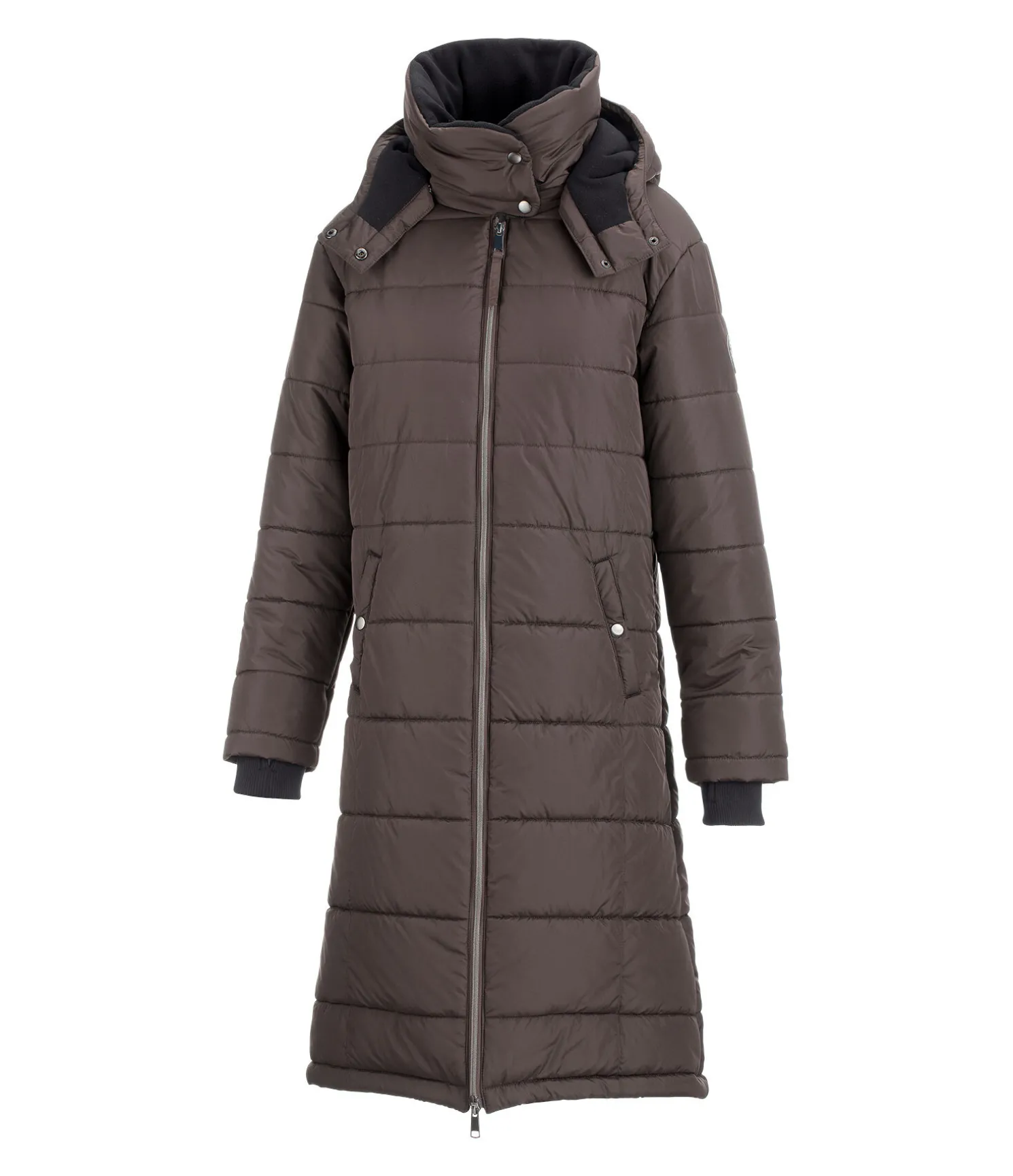 Manteau d’équitation extra long et chaud. Col haut doublé en polaire douce. Capuche doublée amovible. Bas des manches avec passe-pouce. Longue fente cavalière avec fermeture à glissière et soufflet protégeant de la pluie à l’arrière. Fermeture à glissière double sens. Courroies de cuisses. Deux grandes poches latérales avec bouton-pression et une poche intérieure zippée. Ajustable au niveau de la taille avec cordon de serrage. Rembourrage chaud. 100 % polyester.