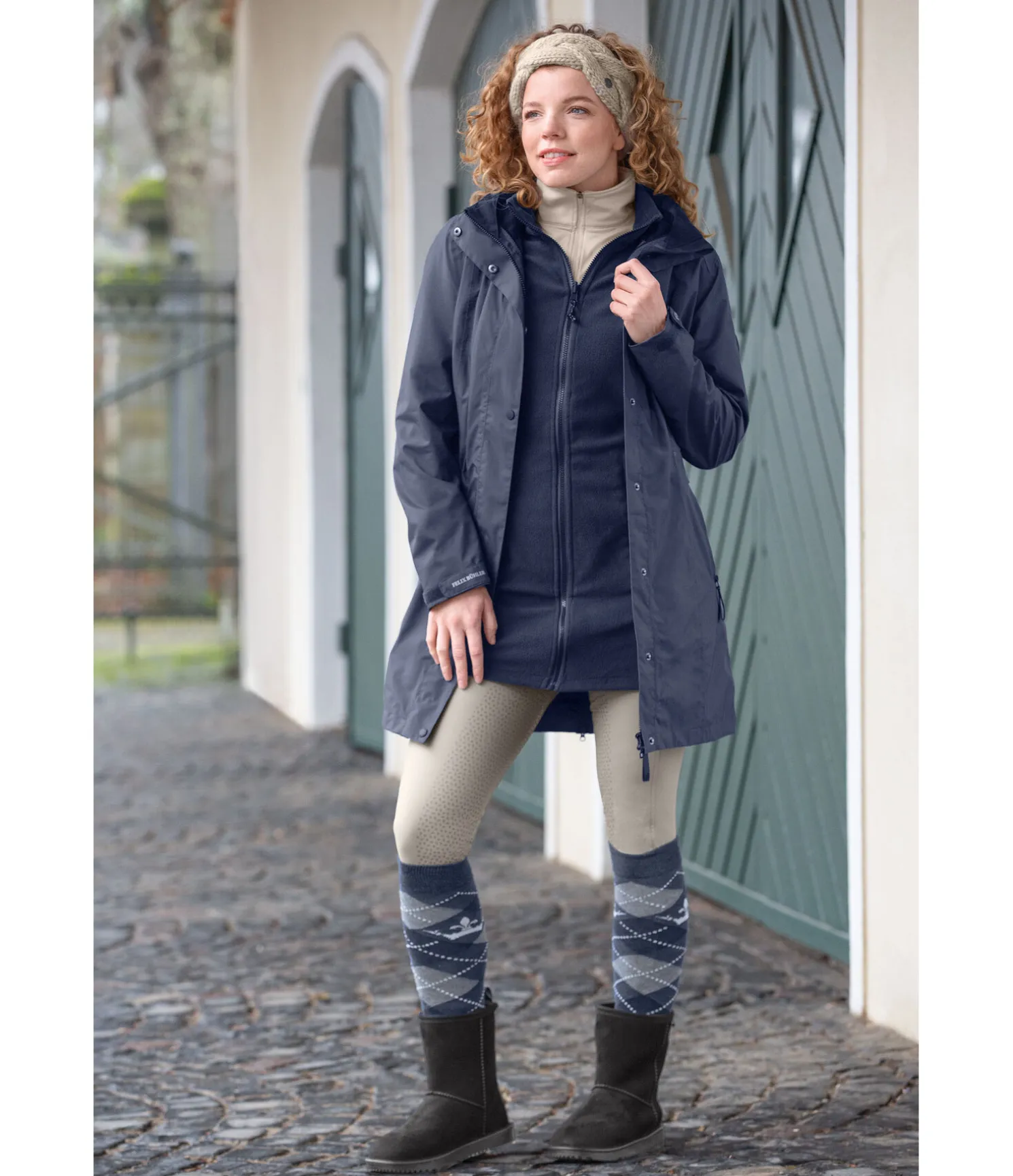 Le manteau d’équitation technique Felix Bühler offre 3 styles différents : tu peux porter chaque couche séparément ou ensemble ! Le manteau extérieur coupe-vent, imperméable (10.000 mm) et respirant possède une capuche réglable et amovible, pouvant être fixée dans le dos par bouton-pression. Fermeture à glissière double sens dissimulée avec protège-menton, 2 poches zippées imperméables, cordon de serrage à la taille, bas des manches réglables par patte auto-agrippante avec imprimé réfléchissant, 1 poche intérieure zippée, 1 longue fente cavalière avec sous-patte et fermeture à glissière à l’arrière. La doublure en polaire se fixe avec une fermeture à glissière et peut donc être portée avec ou sans le manteau extérieur. Cette doublure a un col montant, 2 poches zippées et une fente cavalière avec fermeture à glissière à l’arrière. 100 % polyester.