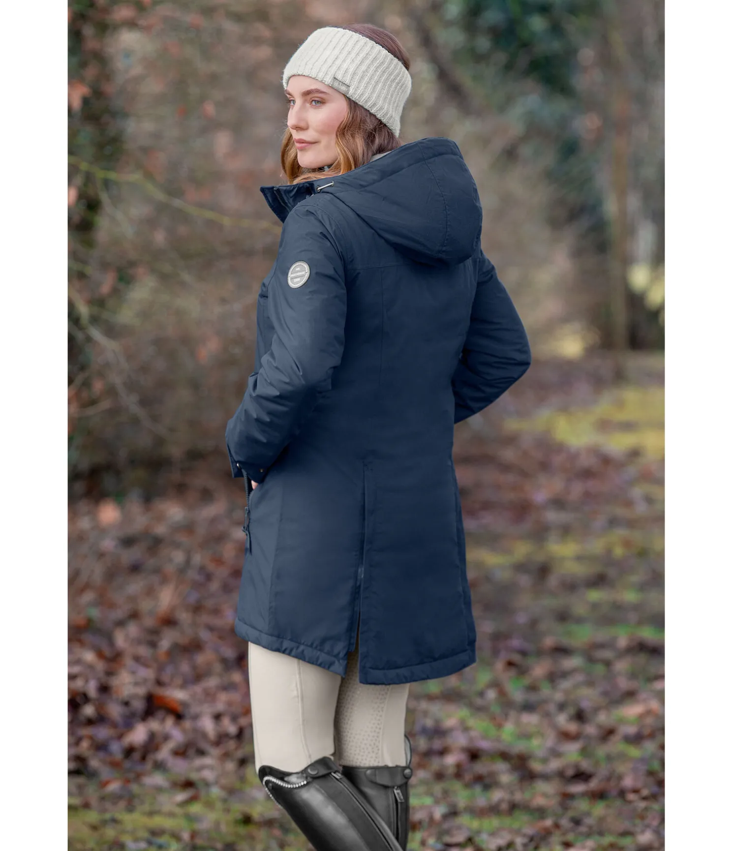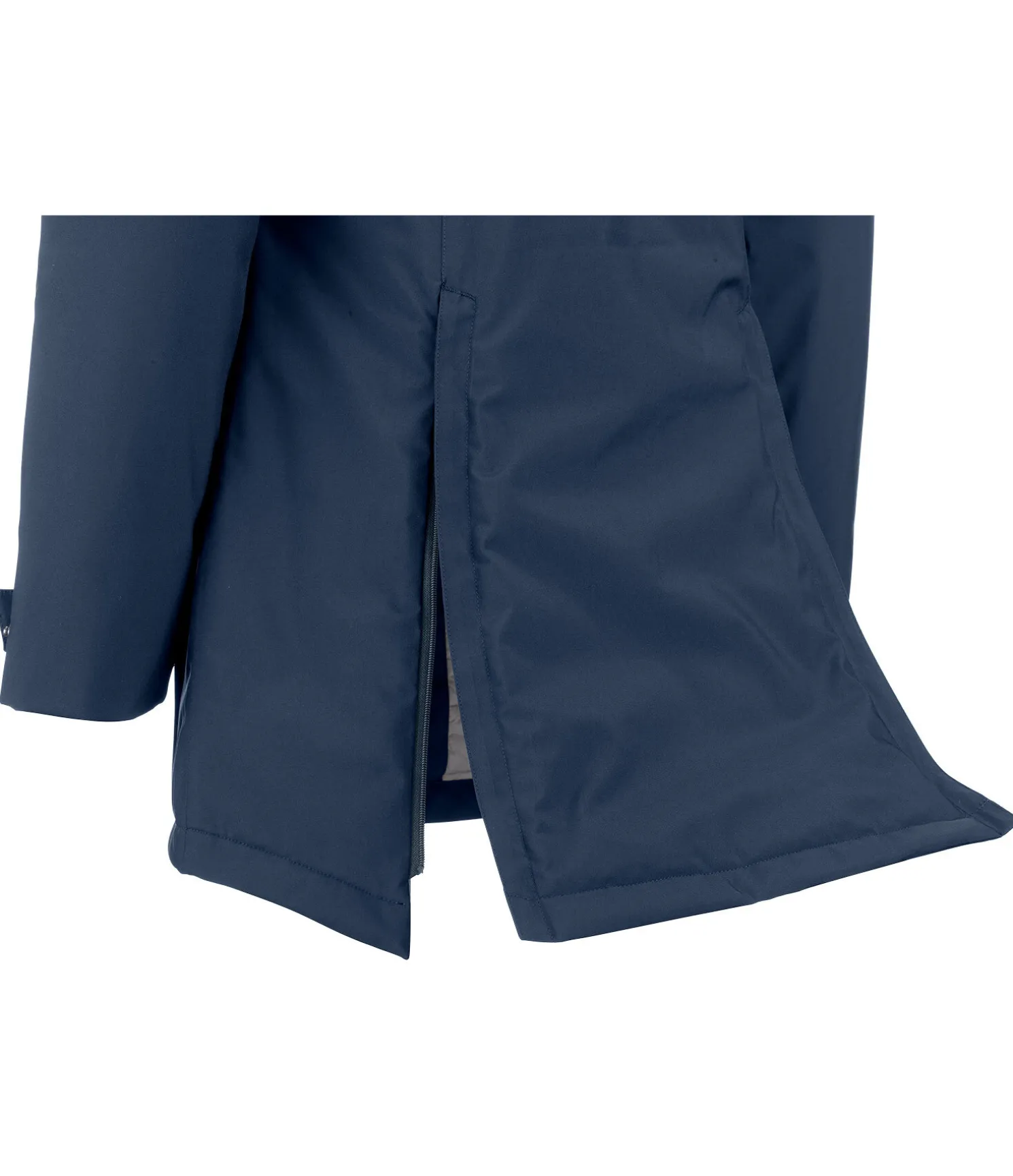Manteau d’équitation technique avec garnissage chaud en imitation duvet et capuche. Imperméable (10.000 mm), coupe-vent et respirant. Fermeture à glissière double sens avec sous-patte, 2 poches zippées devant, 1 poche intérieure zippée, bas des manches réglables, col haut avec capuche rembourrée réglable. 2 fentes cavalières zippées à l’arrière. Badge Felix Bühler sur la manche et imprimé réfléchissant Felix Bühler sur le col. 100 % polyester.