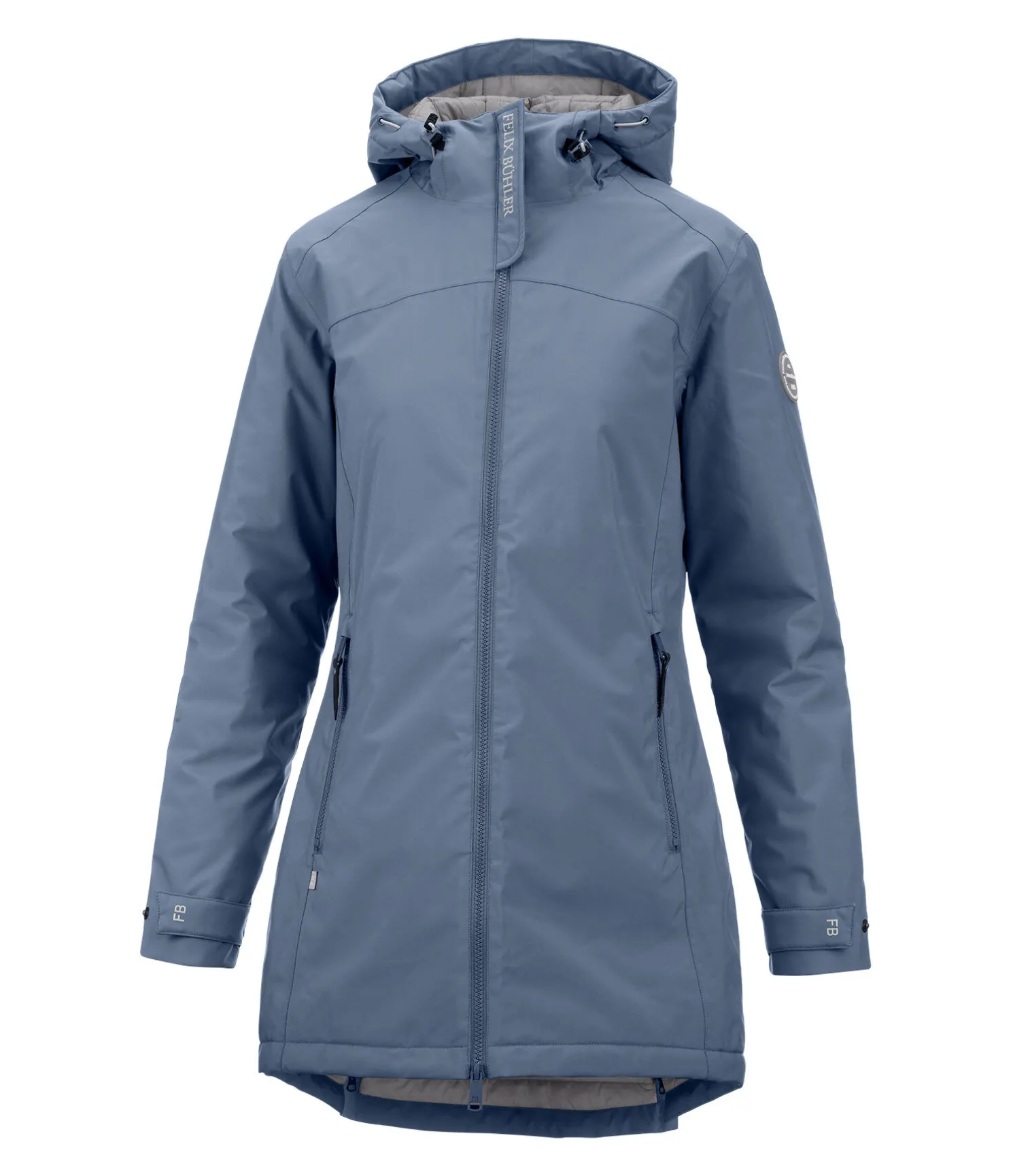 Manteau d’équitation technique avec garnissage chaud en imitation duvet et capuche. Imperméable (10.000 mm), coupe-vent et respirant. Fermeture à glissière double sens avec sous-patte, 2 poches zippées devant, 1 poche intérieure zippée, bas des manches réglables, col haut avec capuche rembourrée réglable. 2 fentes cavalières zippées à l’arrière. Badge Felix Bühler sur la manche et imprimé réfléchissant Felix Bühler sur le col. 100 % polyester.