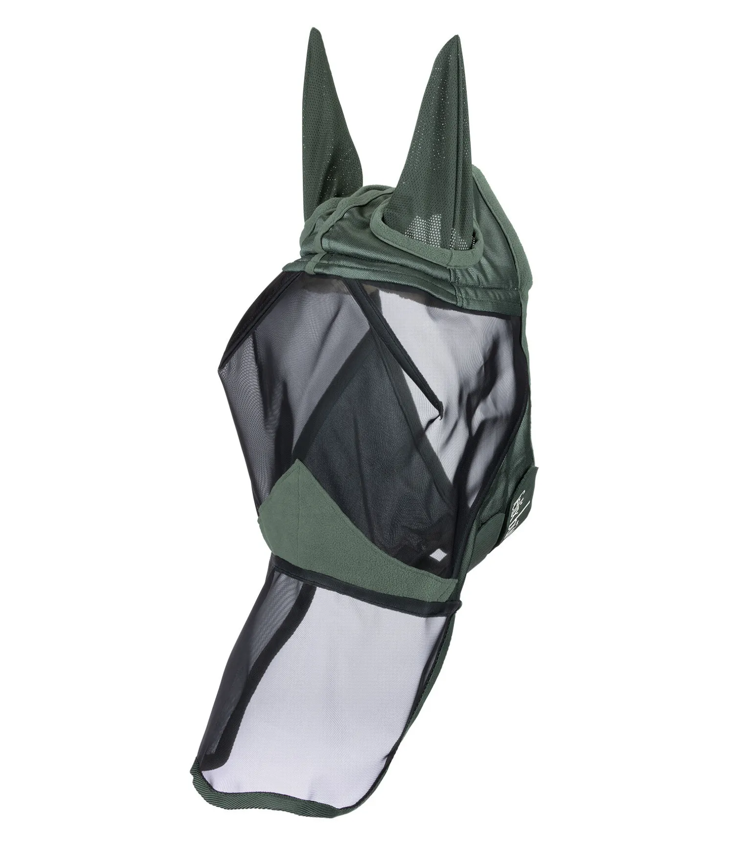 Masque anti-mouches avec protège-naseaux extra-long, pour les chevaux sensibles et / ou ayant tendance à secouer la tête. Mailles serrées et coutures permettant de maintenir le filet à distance des yeux. Matière à mailles respirantes aux oreilles. Protège parfaitement les oreilles et les yeux contre les moustiques et autres insectes. Doublure en polaire Teddy douillette au niveau du front pour éviter les irritations dues aux frottements. Avec passage de toupet et double patte auto-agrippante pour un maintien sûr. 100 % polyester.