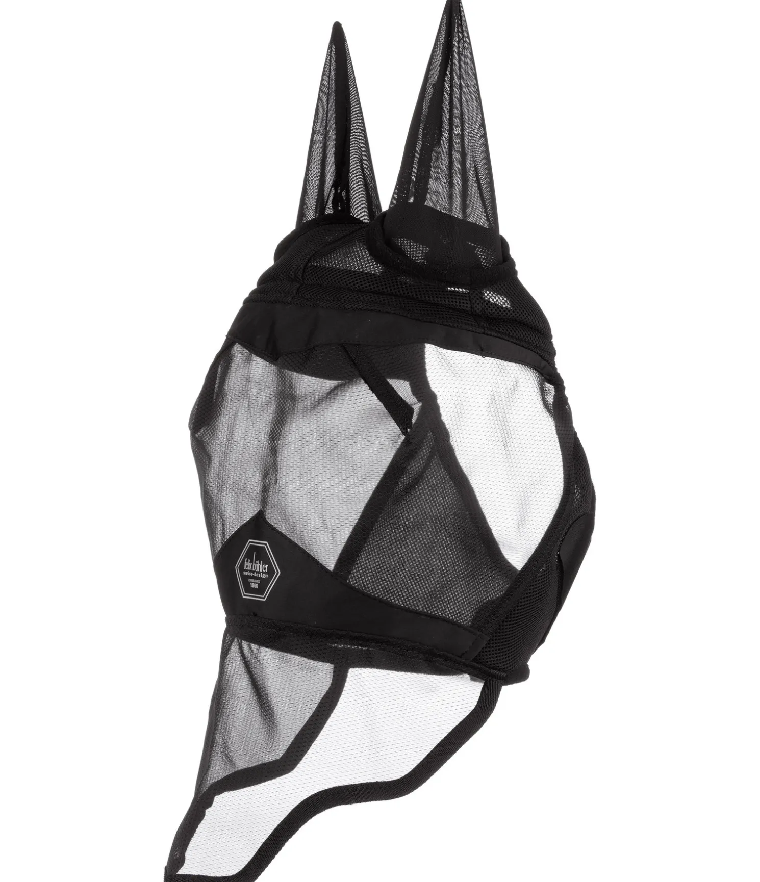 Masque anti-mouches en mesh MVT (Moisture Vapor Transmission) respirant, qui permet une circulation de l’air constante sous le masque et évite ainsi la surchauffe, avec protège-naseaux. Protège parfaitement les oreilles, les naseaux et les yeux contre les moustiques et autres insectes. Mailles serrées résistantes Ripstop et coutures permettant de maintenir le filet à distance des yeux. Le protège-naseaux anatomique permet de protéger cette zone sensible sans énerver le cheval ni gêner sa respiration. Doublure en tissu éponge absorbant au niveau du front pour un confort optimal et bordure en polaire autour du chanfrein pour éviter les irritations dues aux frottements. Matière stretch extensible perforée aux oreilles. Large patte auto-agrippante pour une mise en place et un retrait faciles et rapides. Protection UV 60+ (selon la norme BS EN 13758-1:2002 + A1:2006: textiles – protection contre les rayons ultraviolets du soleil). 100 % polyester.