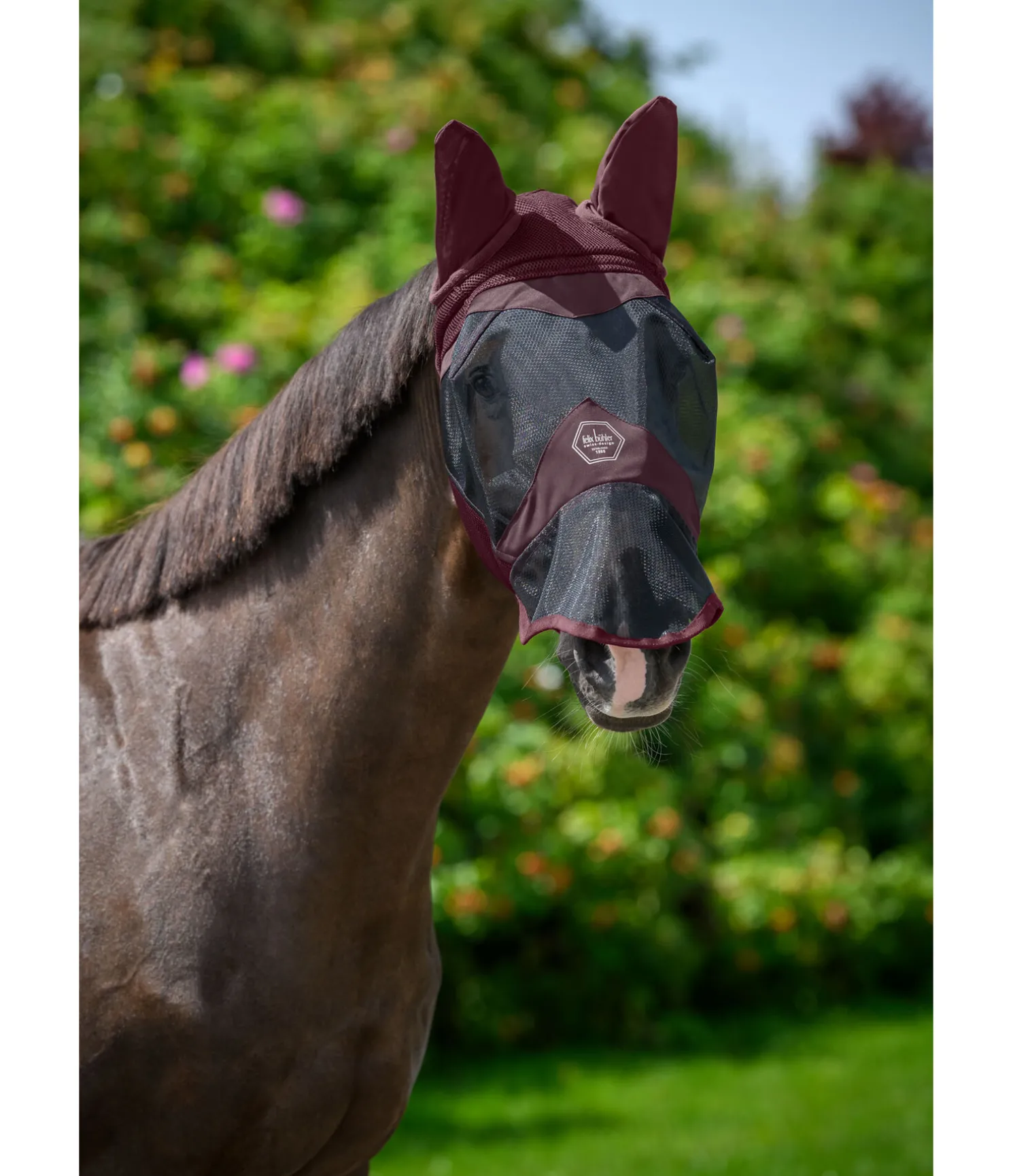 Masque anti-mouches en mesh MVT (Moisture Vapor Transmission) respirant, qui permet une circulation de l’air constante sous le masque et évite ainsi la surchauffe, avec protège-naseaux. Protège parfaitement les oreilles, les naseaux et les yeux contre les moustiques et autres insectes. Mailles serrées résistantes Ripstop et coutures permettant de maintenir le filet à distance des yeux. Le protège-naseaux anatomique permet de protéger cette zone sensible sans énerver le cheval ni gêner sa respiration. Doublure en tissu éponge absorbant au niveau du front pour un confort optimal et bordure en polaire autour du chanfrein pour éviter les irritations dues aux frottements. Matière stretch extensible perforée aux oreilles. Large patte auto-agrippante pour une mise en place et un retrait faciles et rapides. Protection UV 60+ (selon la norme BS EN 13758-1:2002 + A1:2006: textiles – protection contre les rayons ultraviolets du soleil). 100 % polyester.